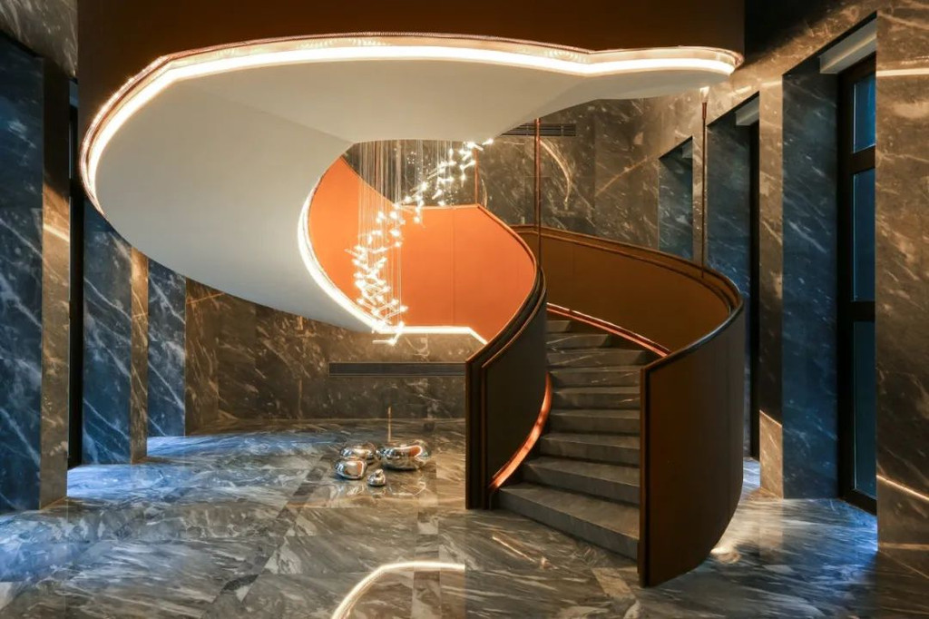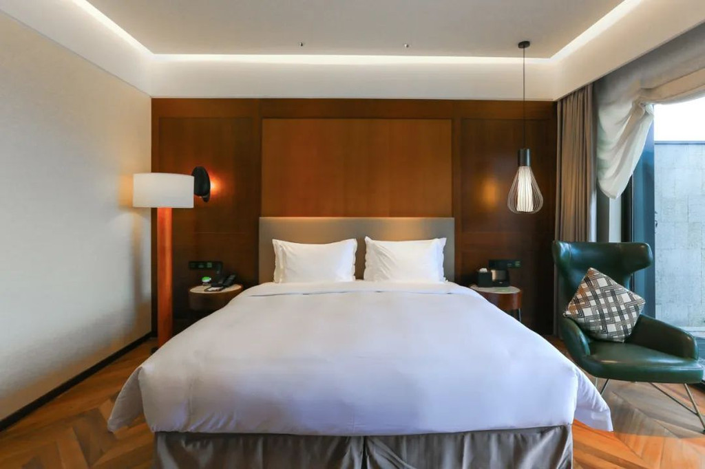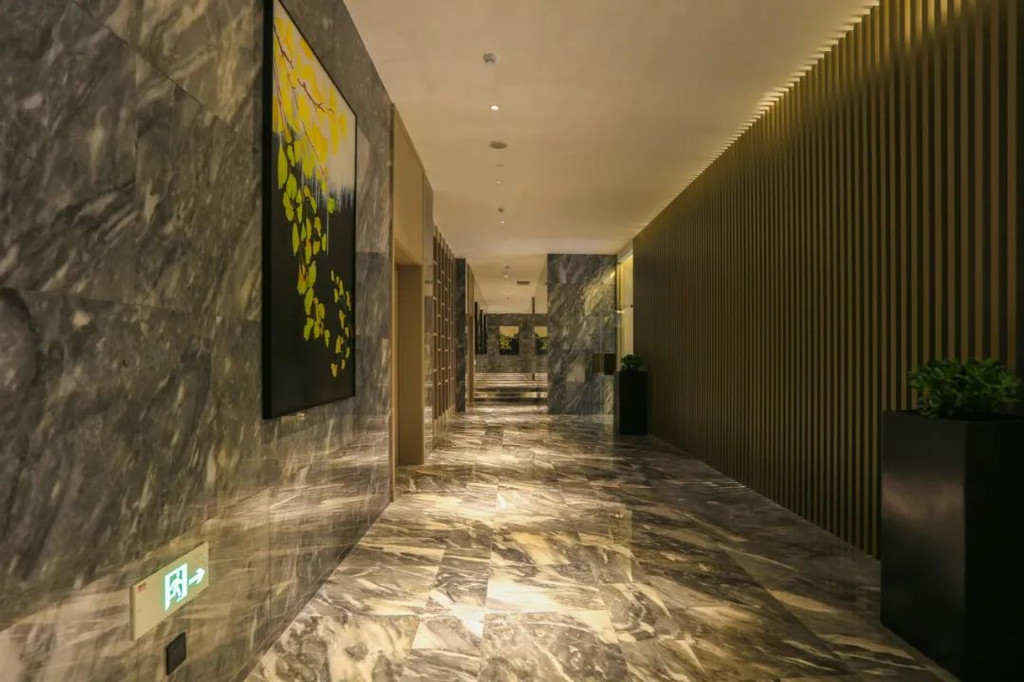 在公共区域里,苏绣、团扇、太湖石等极具本地个性的元素被解构成网红款旋转楼梯、装饰画等,融入到整体的环境中去。而太多的装饰小品,出现在客房的廊道一角或是大堂的拐角空间里,精致地展示着江南风情。