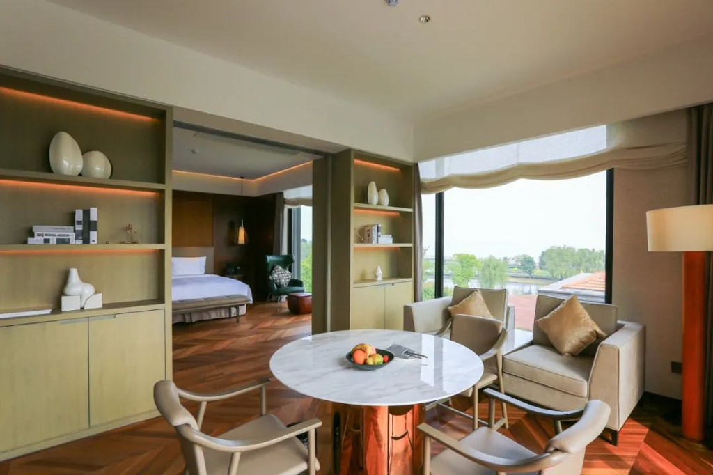 而同样位于客房指廊另一顶端的湖景套房,则展现出宽敞无比的气度,严格区分的客厅与卧室,超大的卫浴空间,直面湖景的宽敞露台。非常适合高端商旅体验。