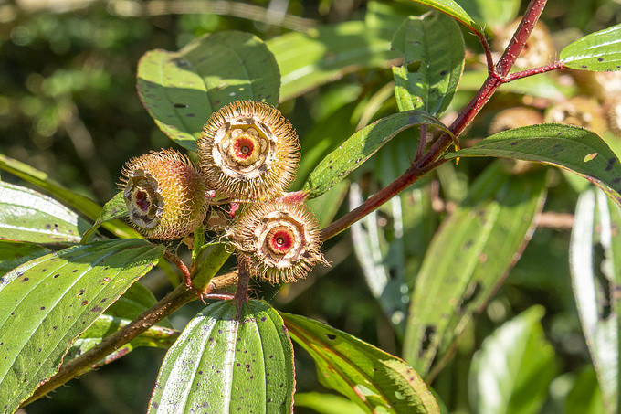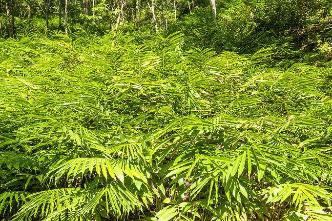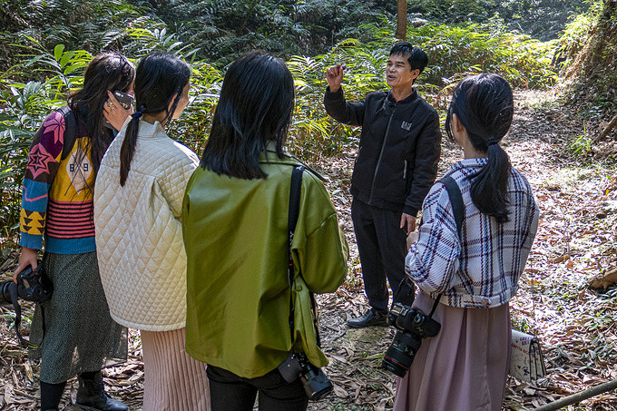 鸡笼顶上的景色非常独特,所有的小山都长满了青翠的灌木,灌木林和草地有明显的区别。山背上一层厚厚的草皮,最高的草不超过20厘米。这里动植物种类多,负离子浓度高,水资源丰富,非常适合“森林浴”。