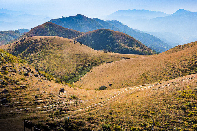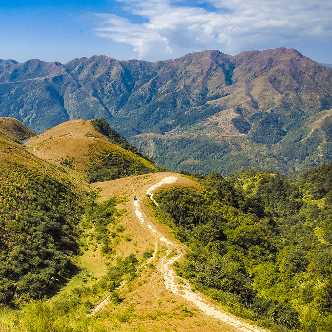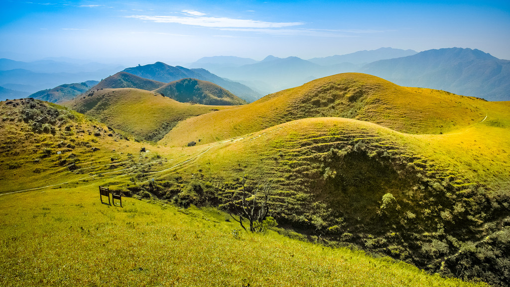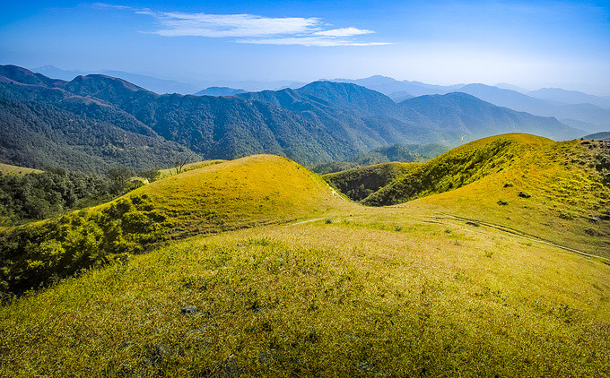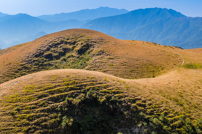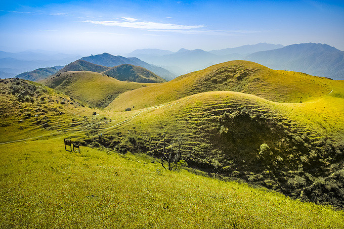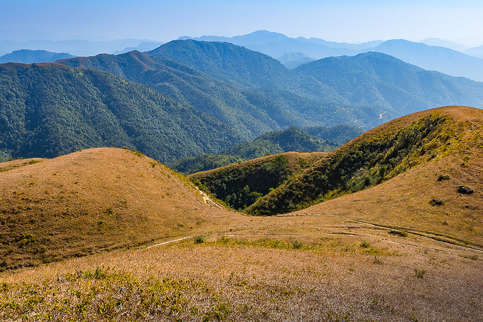一路沿着上山的小路前行,随着高度的变化,鸡笼顶的美景逐渐展现,其独特的山势并不像其他山脉那样陡峭险峻,也没有茂盛的树木,而是地势开阔、山的坡度平缓,活脱脱的一个大草原,让你感到非常惊讶,它就像北方的呼伦贝尔草原一样!
