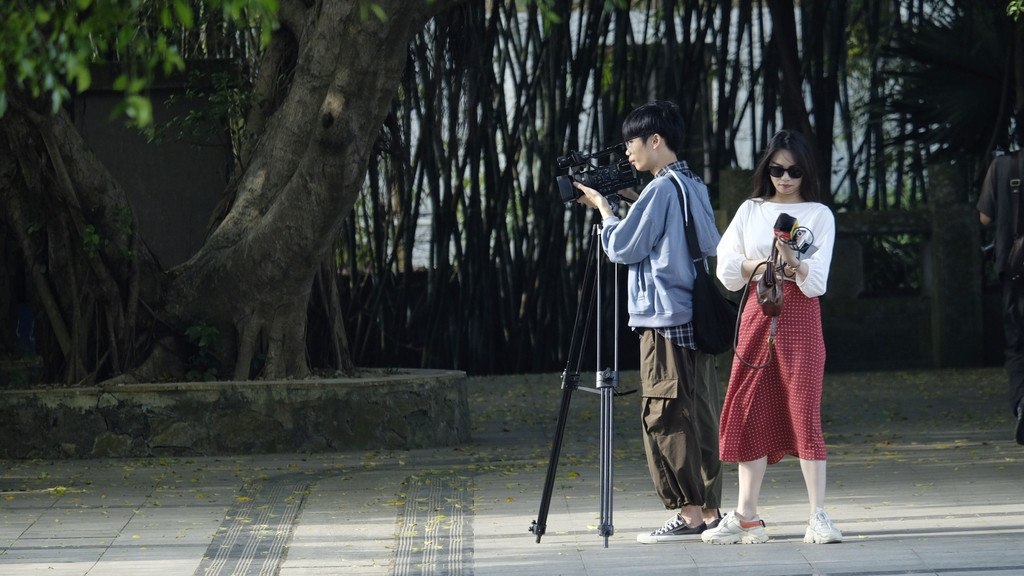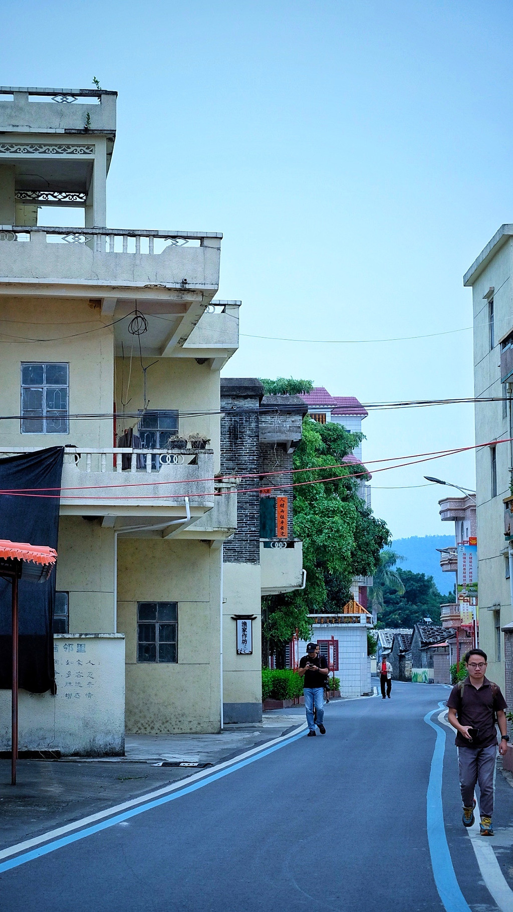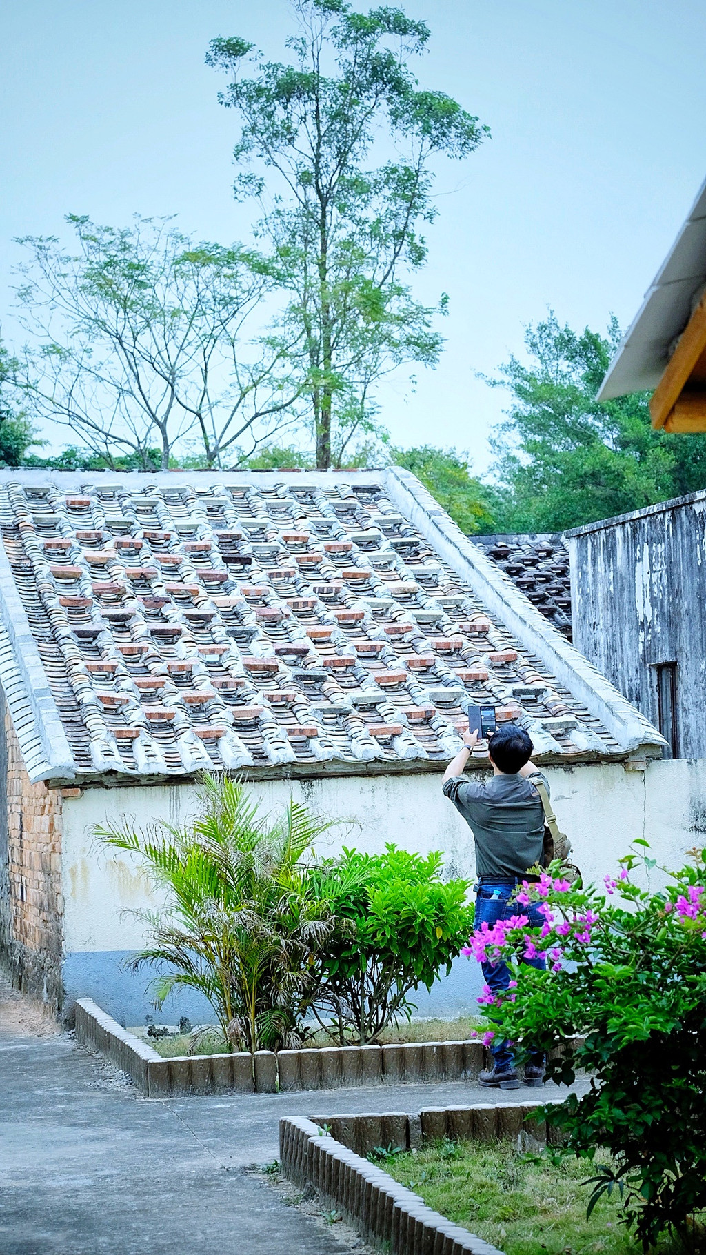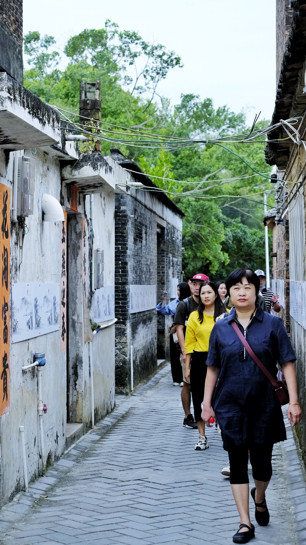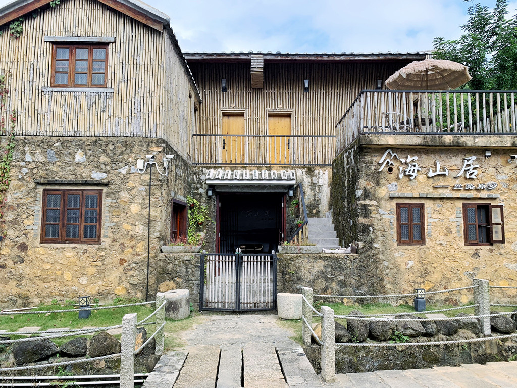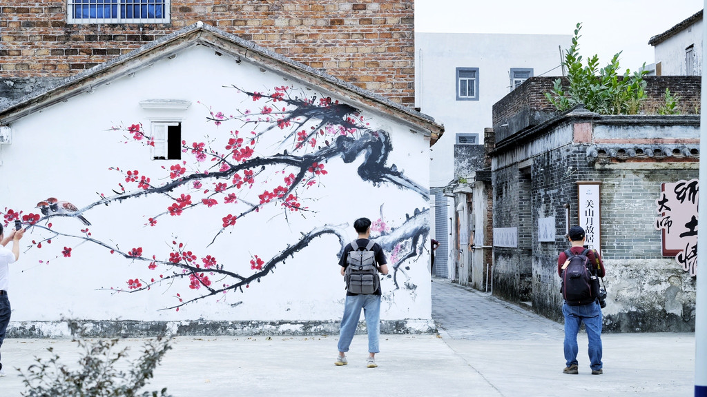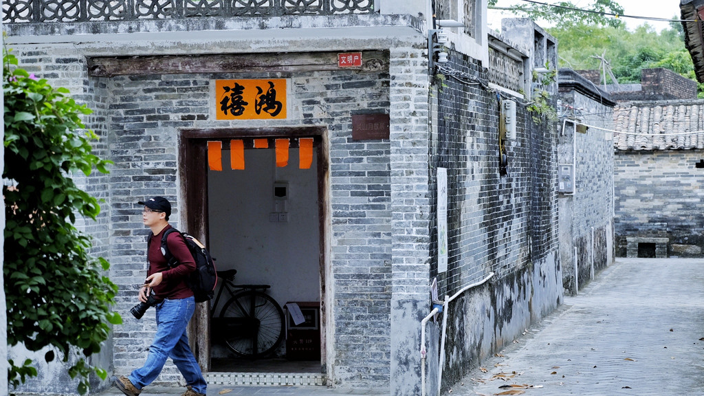 一路下行,一座座极具岭南风格特色的旧式民居林立,绿水绕屋、千年古树、青石栈道勾勒出一幅恬静而素雅的美丽画卷。数名游客正围着“海山居”拍照留念,在石墙老宅里触摸往昔时光。