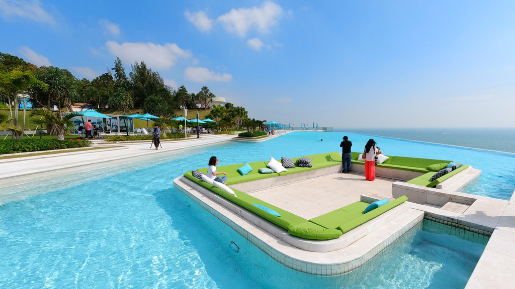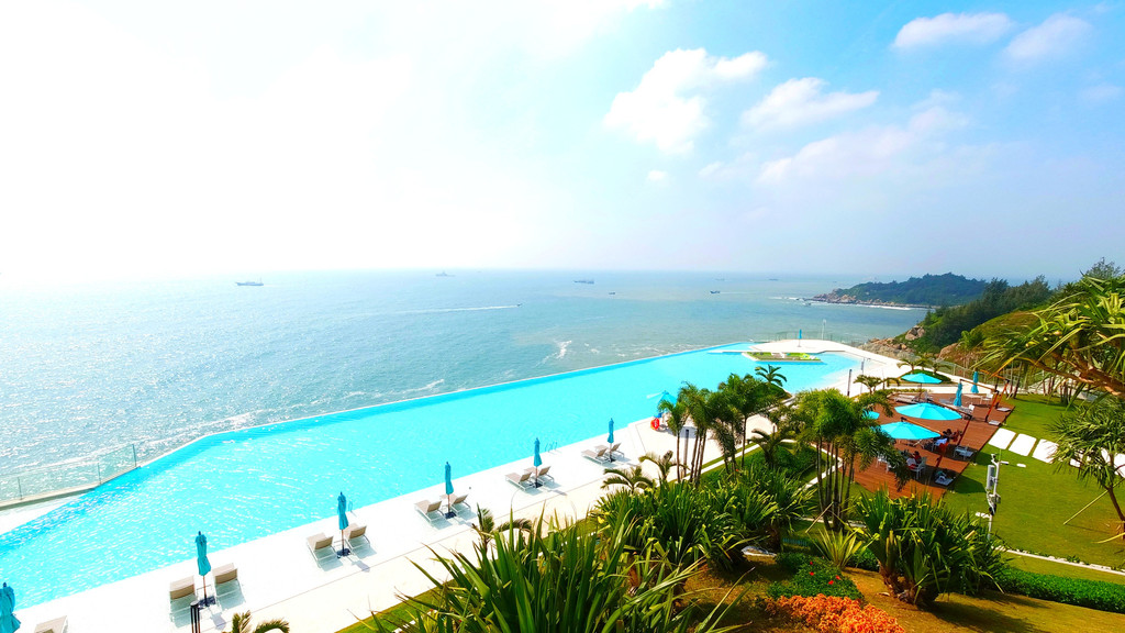 中国唯一高空临海天际泳池,每天来往于北洛秘境的无边天际泳池的游客都络绎不绝,泳池在北洛秘境酒店A栋30楼天台,面积达700m,好似一艏巨轮俯卧在海岸边,其中只有两台电梯可以直上30楼,另外的都是到29楼的,所以可以到29楼再走楼梯上去。泳池开放时间是7:30---22:00,进入泳池有两种方法,第一种是持有酒店房卡可以免费游泳,另外一种自然就是买纯票了,记得是238块游两个小时。