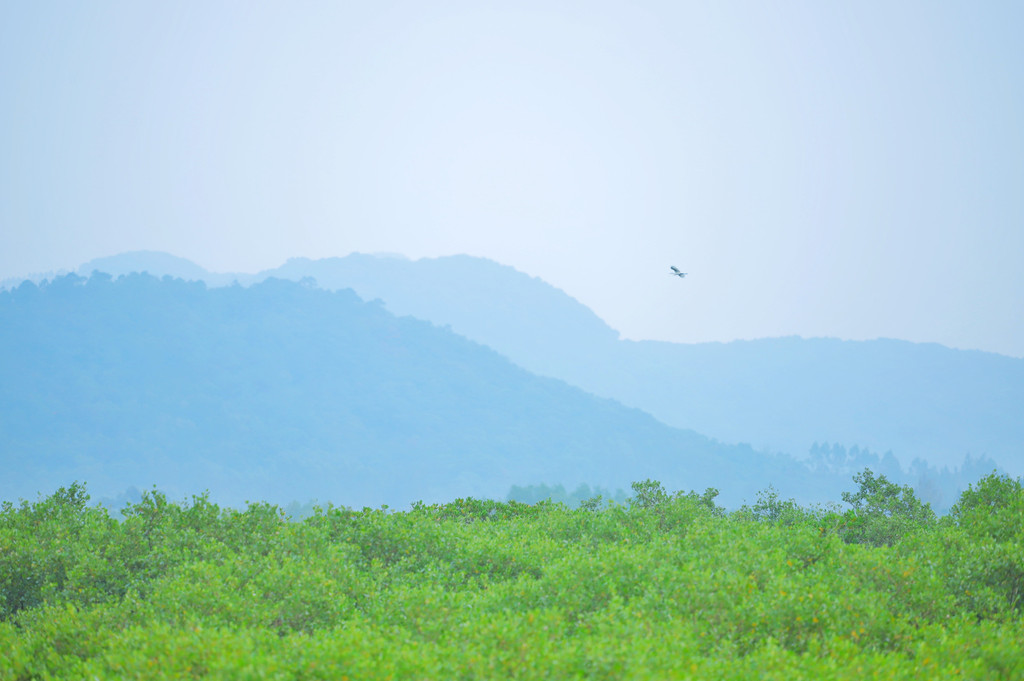由于本地浅海海产丰富,常有白鹭等海鸟在此觅食,它们时而停靠海边时而在空中飞翔,在红霞与红树林衬托下,呈现出一派和谐之美。