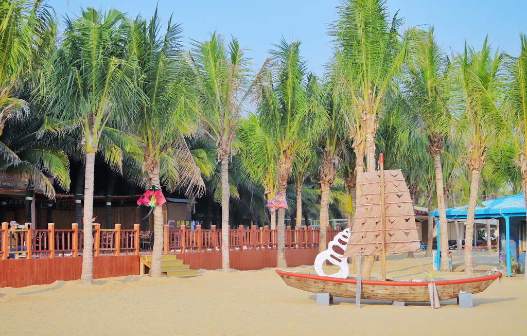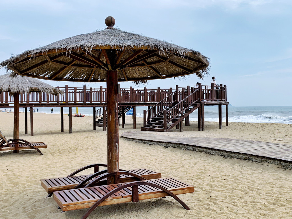 海滩上还设置了很多供游客避暑观赏的凉棚,玩累了你还可以躺着看别人玩水嬉戏,再来一瓶冰镇椰子水岂不快哉!想象一下在夕阳西下的时候牵着爱人孩子的手漫步在轻柔于温暖的浅水滩上,偶尔来个踢脚戏水、捡捡贝壳、背着孩子和爱人赛跑,好不惬意啊!