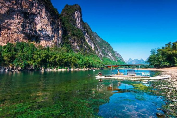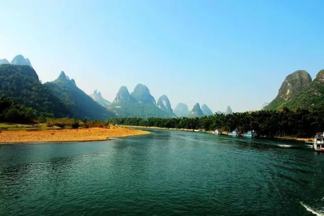而漓江风光最优美的路段,是启程码头到兴坪之间约40公里的河道上。