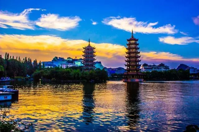 杉湖的日月双塔是桂林的新地标建筑,日塔金碧辉煌,是世界上最高的铜塔;月塔采用琉璃装饰,端庄典雅。