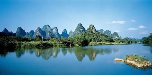 漓江像一条青绸绿带,平静的河水倒映出梦幻般的美景。