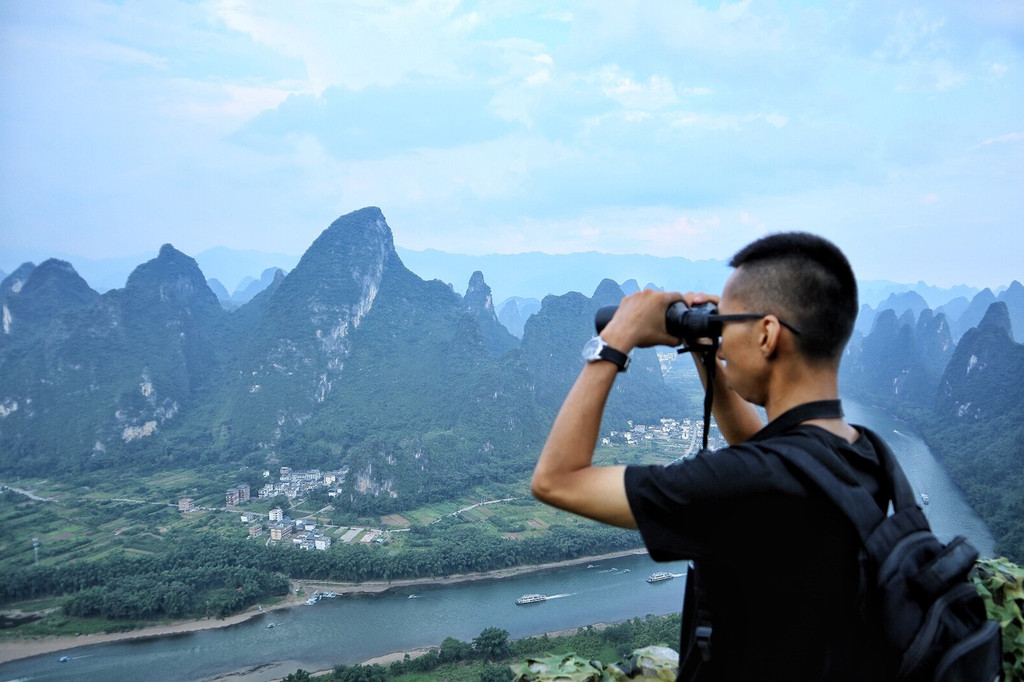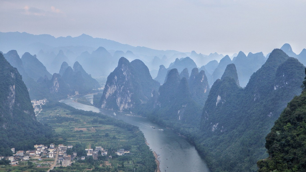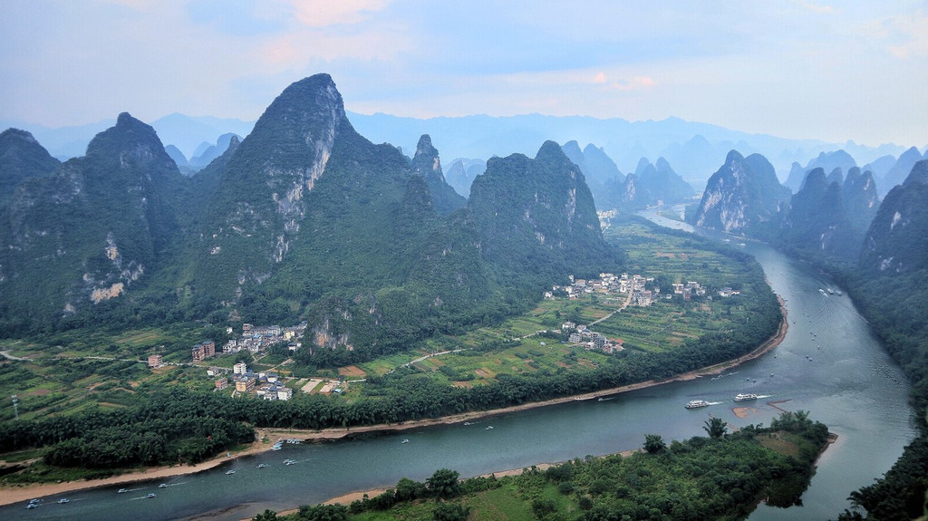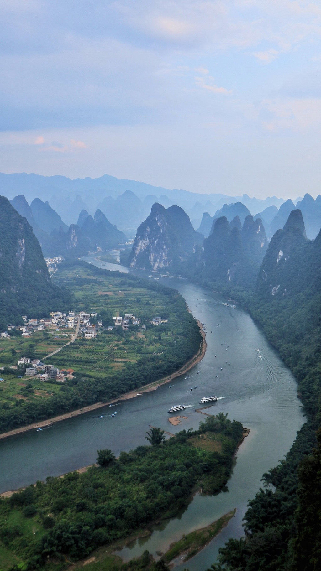 登上相公山举目远眺,群峰排列有序,蜿蜒流淌的 漓江 甚是美妙。