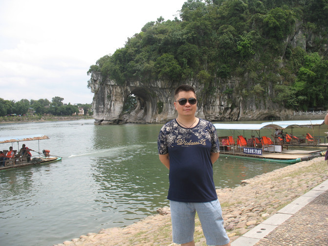 12点40分到达人鱼公主爱家庭清新两房旅店,稍事休息后出发打车10元至象鼻山2号门,取票进入景区(每人45元),2号门应该是欣赏象鼻山最方便的门,一进大门,直接进入眼帘的就是整个象鼻山,留影合照完毕后,向右200米过桥就来到象鼻山下,顺着楼梯向上攀登至顶,