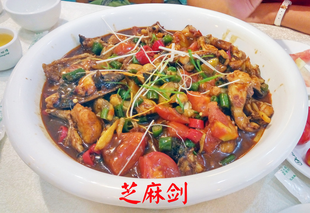 晚上在旅店附近吃大排档的野生鱼和香辣蟹。
