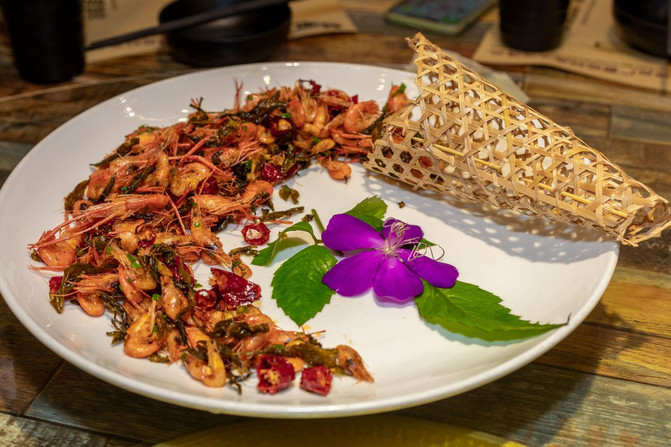 土菜,听着颇为乡土的名字,其实土菜用了很多本地特产的食材。而且秉承不时不吃的原则,选择各种时令的食材,更是新鲜 和美 味。雷公菌是这里特色的一种菌类,只有在雨后才能找到。雷公菌爽口,加上这里常见的酸豆角和辣椒一起炒香,非常下饭。