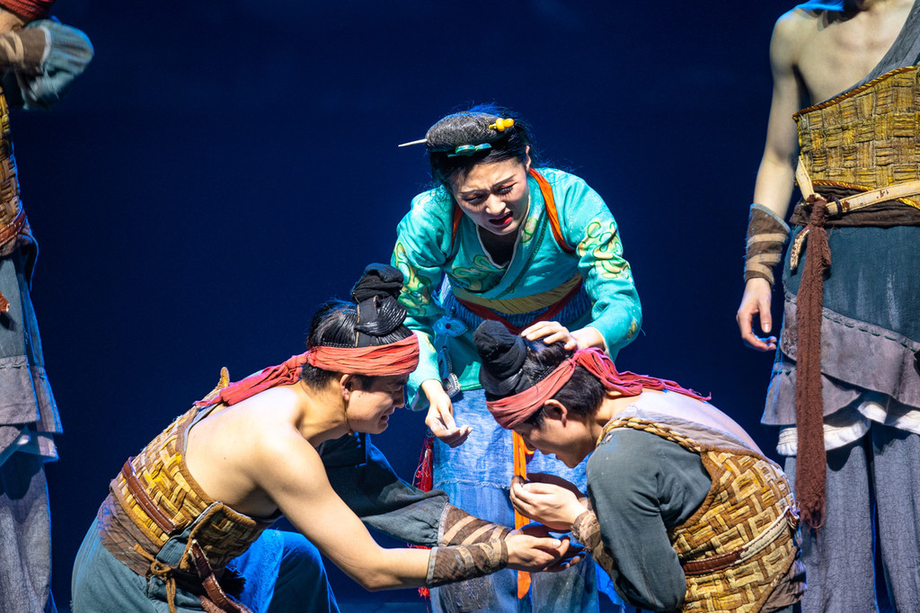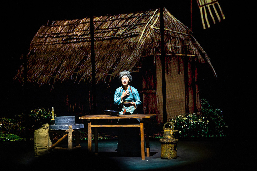 秦征百越时,英嫂为让修筑灵渠的儿子,吃上一口家乡的面食,最终发明 桂林 米粉,——这一幕,让地方名小吃有了情景化的展示,情节坎坷动人,结尾从天而降6米长的米粉,更是将全场的气氛推向了高潮。