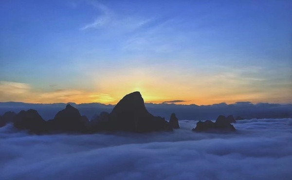 爬上山顶在黑夜中又ー线红色的霞光从水天连接之处溢出来
