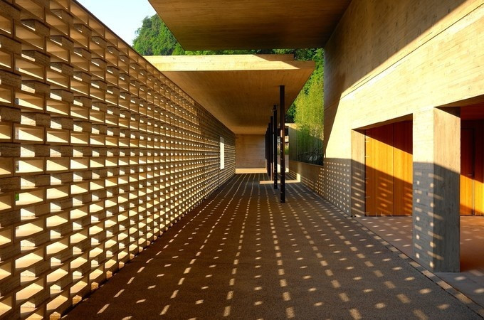 整个新加的客房区和别墅区外观都采用了回形砖的镂空设计