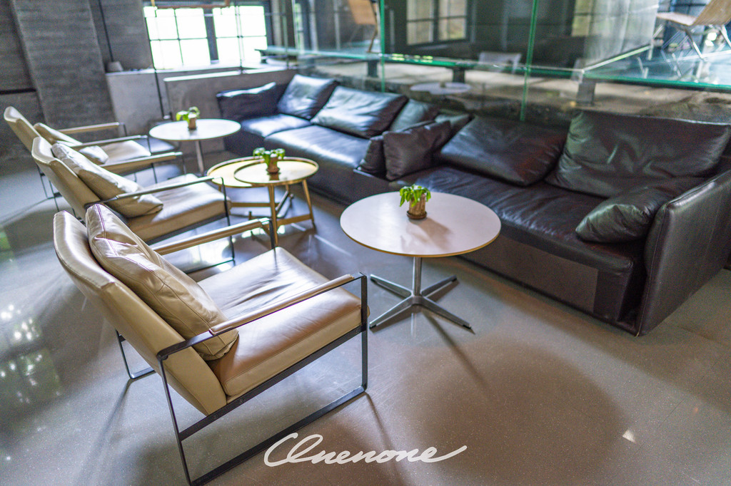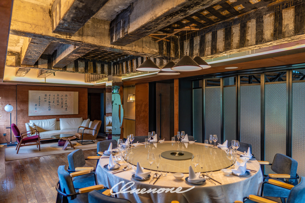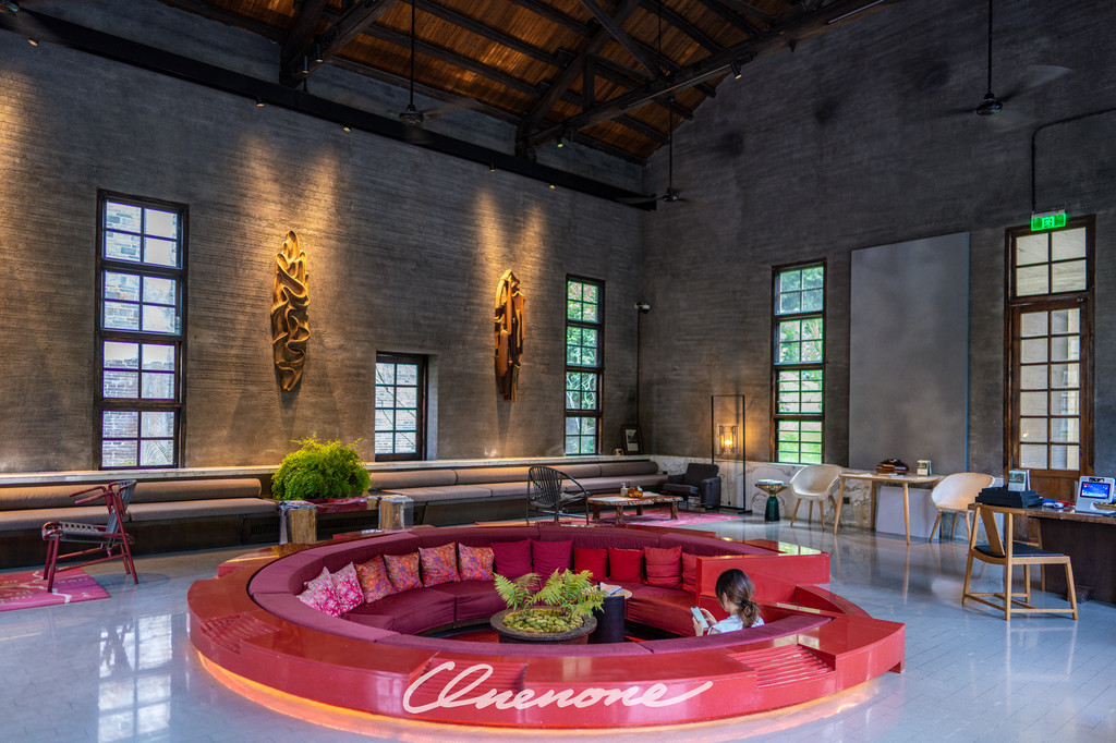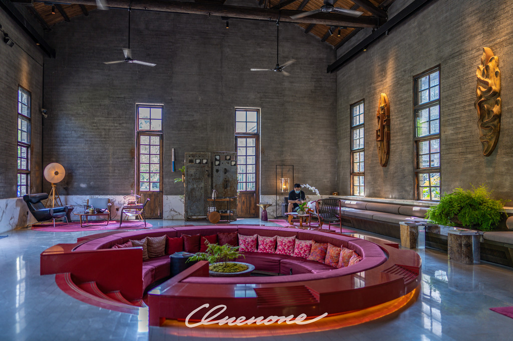 前厅大堂:原来是糖厂的动力车间,以热情的红色为主色调,体现出时尚与明快的现代气息,简约中不乏温馨的感觉。中心位置下沉式的圆形沙发区域与周边四角轻松布置的休憩区域完美结合,营造了舒适休闲的环境氛围。四个角落分别对应不同的功能分布,办理入住的前台位置、三两好友的闲聊空间、团队客人的等待区域、商务接洽的临时场所,设计之巧妙绝伦、空间利用之合理可见一斑。斑驳的旧式变电箱在大堂之中并不显得突兀,反倒与价值不菲的手工缝制真皮单人座椅和纸质灯罩的中古落地灯具相得益彰,岁月的痕迹在此被凝固。