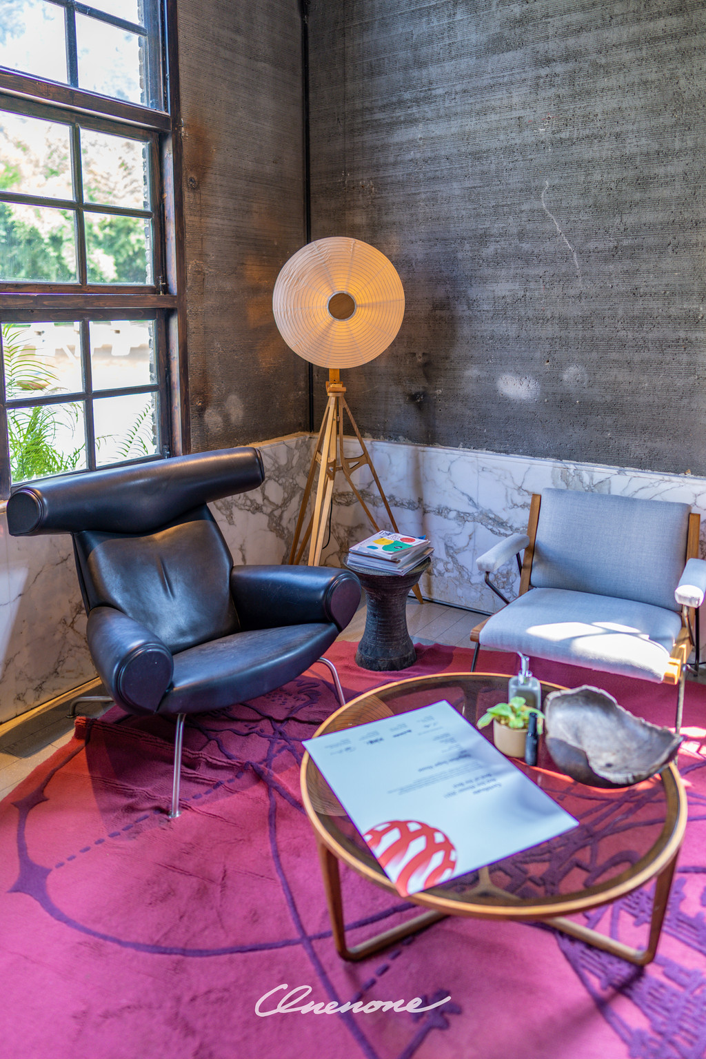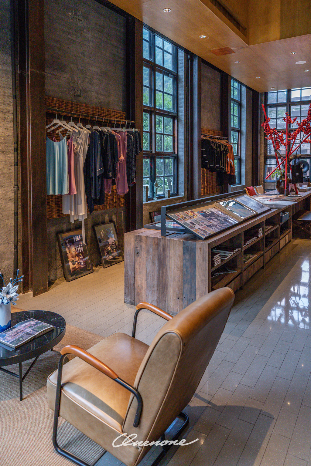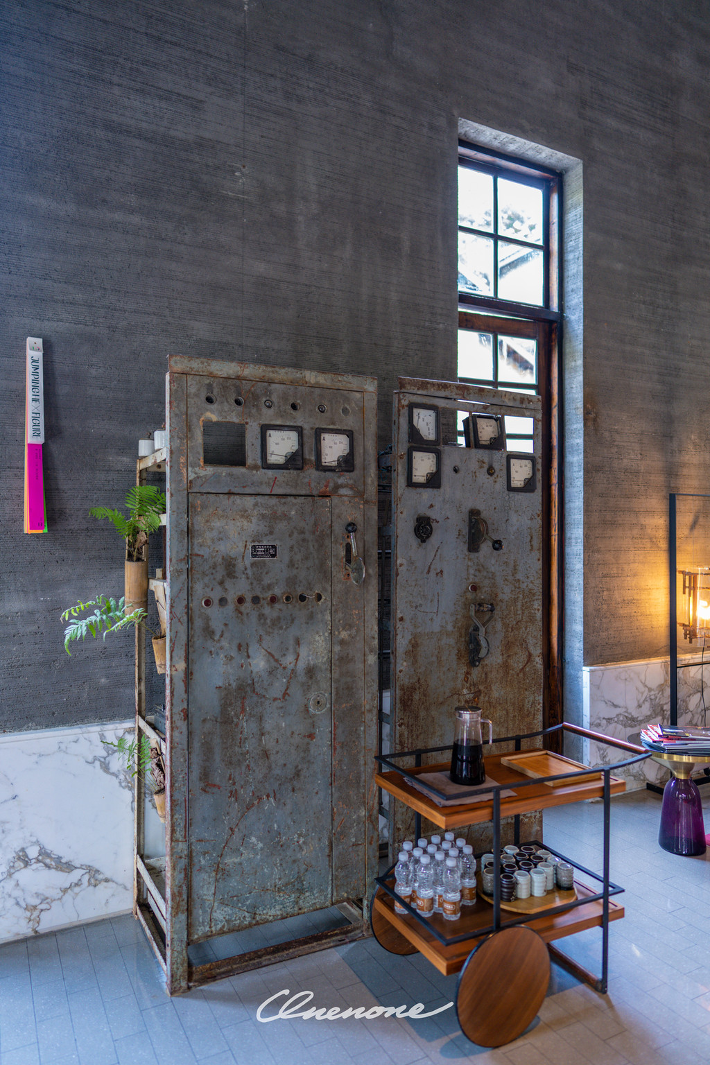 前厅大堂:原来是糖厂的动力车间,以热情的红色为主色调,体现出时尚与明快的现代气息,简约中不乏温馨的感觉。中心位置下沉式的圆形沙发区域与周边四角轻松布置的休憩区域完美结合,营造了舒适休闲的环境氛围。四个角落分别对应不同的功能分布,办理入住的前台位置、三两好友的闲聊空间、团队客人的等待区域、商务接洽的临时场所,设计之巧妙绝伦、空间利用之合理可见一斑。斑驳的旧式变电箱在大堂之中并不显得突兀,反倒与价值不菲的手工缝制真皮单人座椅和纸质灯罩的中古落地灯具相得益彰,岁月的痕迹在此被凝固。