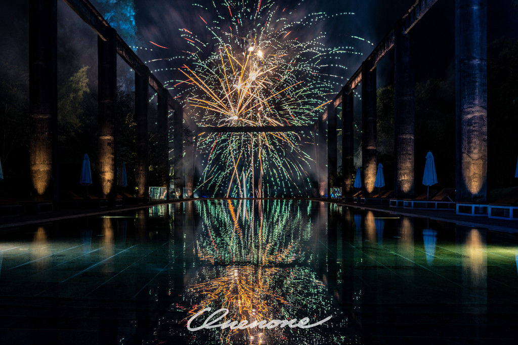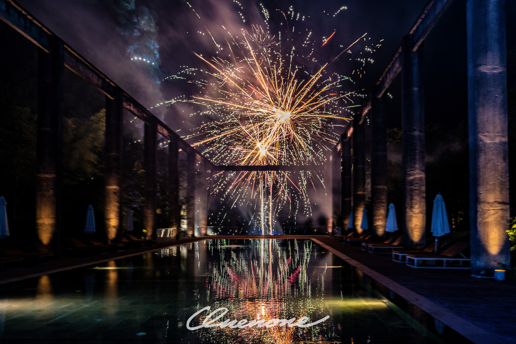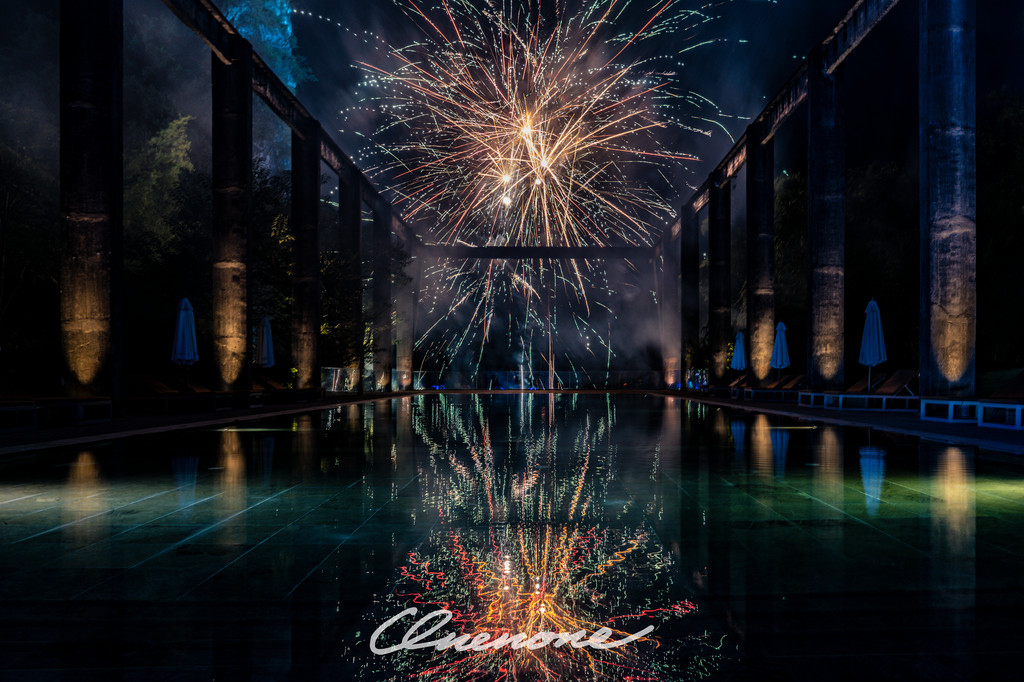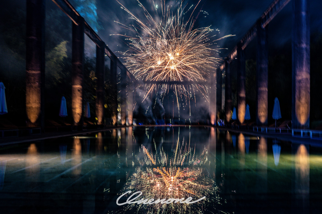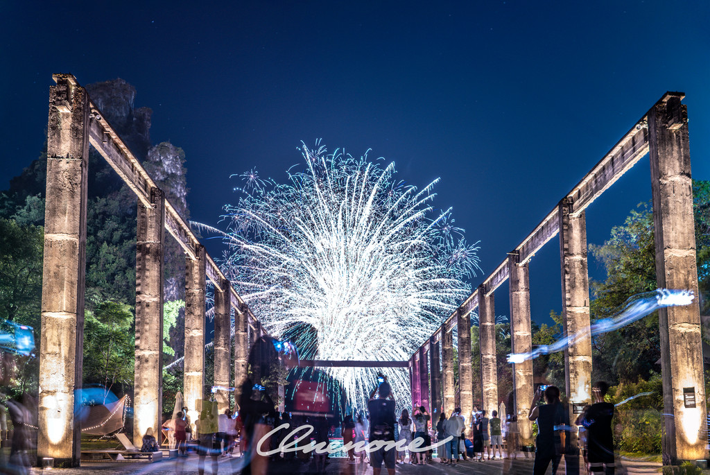 烟火秀:糖舍每周六在漓江山水间,江畔泳池旁燃放的绚烂烟火秀,映衬着古老的工业桁架,营造出深黑夜空中的璀璨景致。