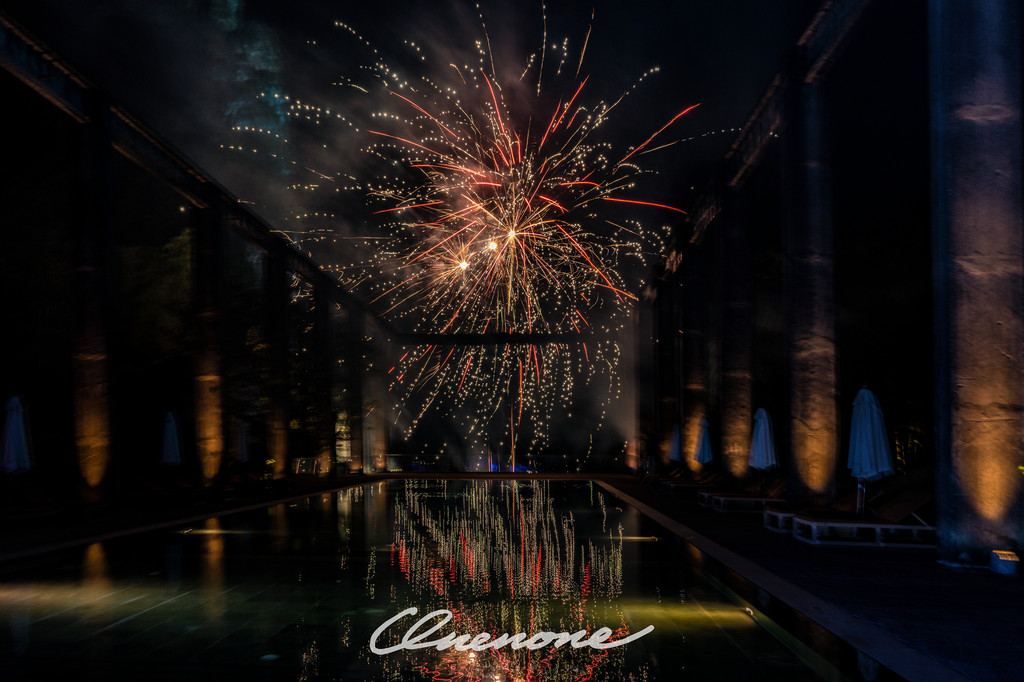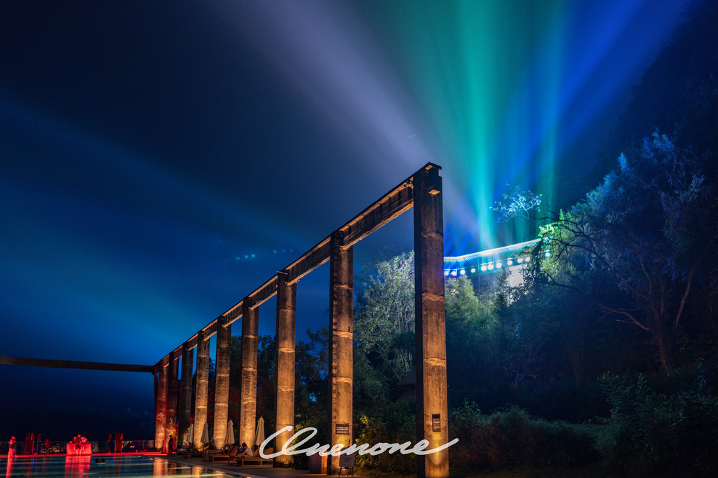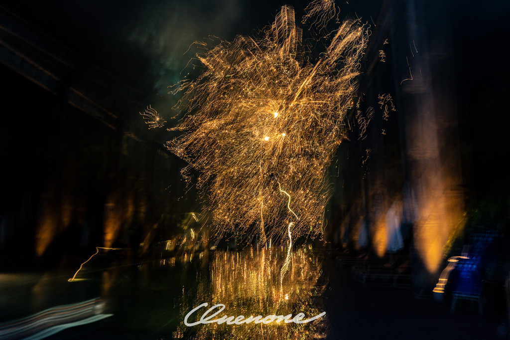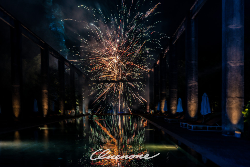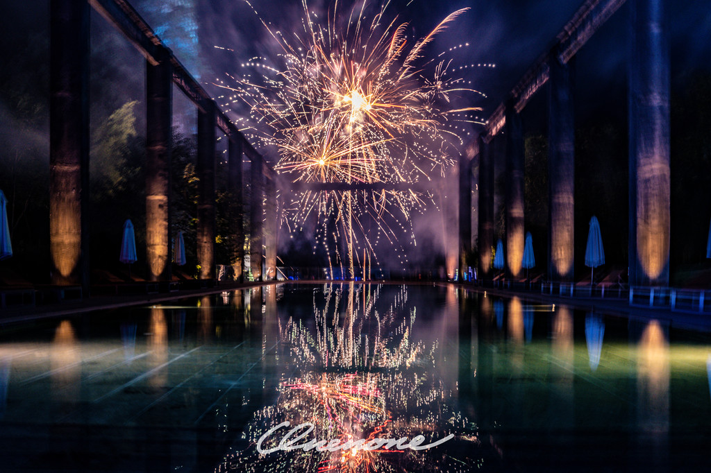 烟火秀:糖舍每周六在漓江山水间,江畔泳池旁燃放的绚烂烟火秀,映衬着古老的工业桁架,营造出深黑夜空中的璀璨景致。