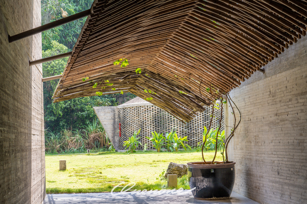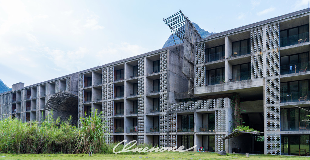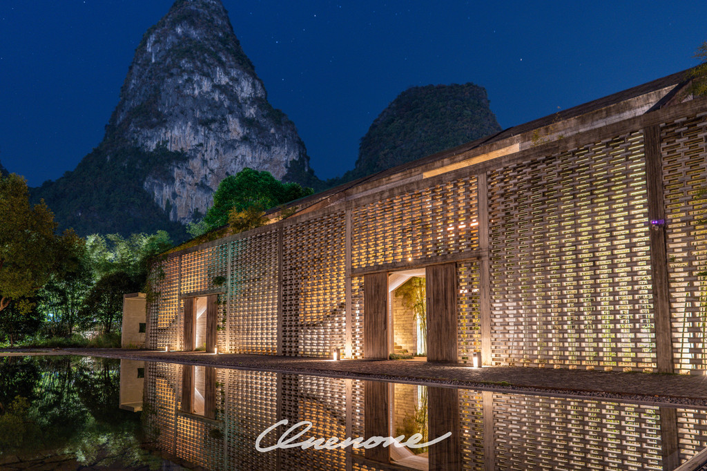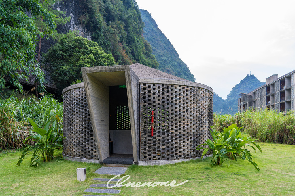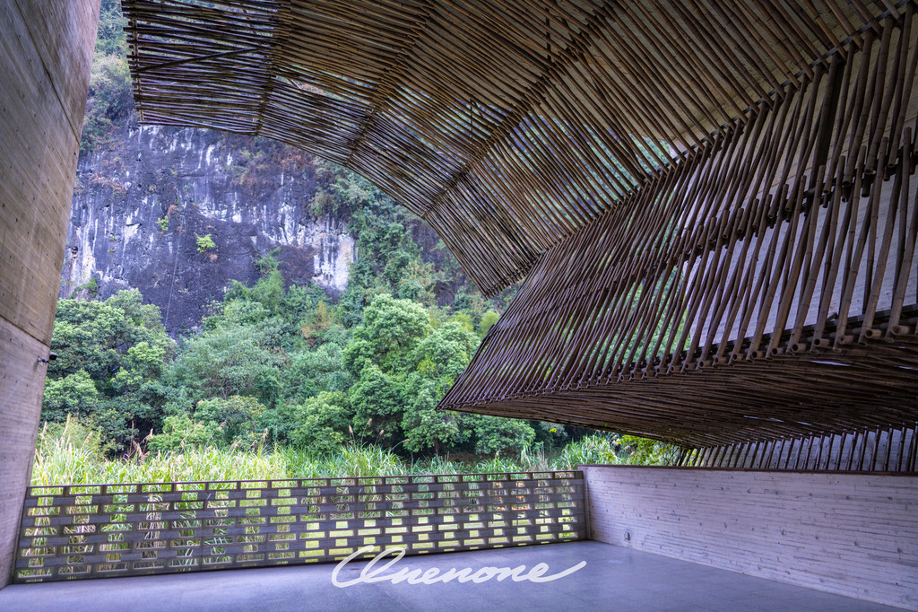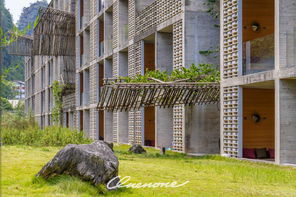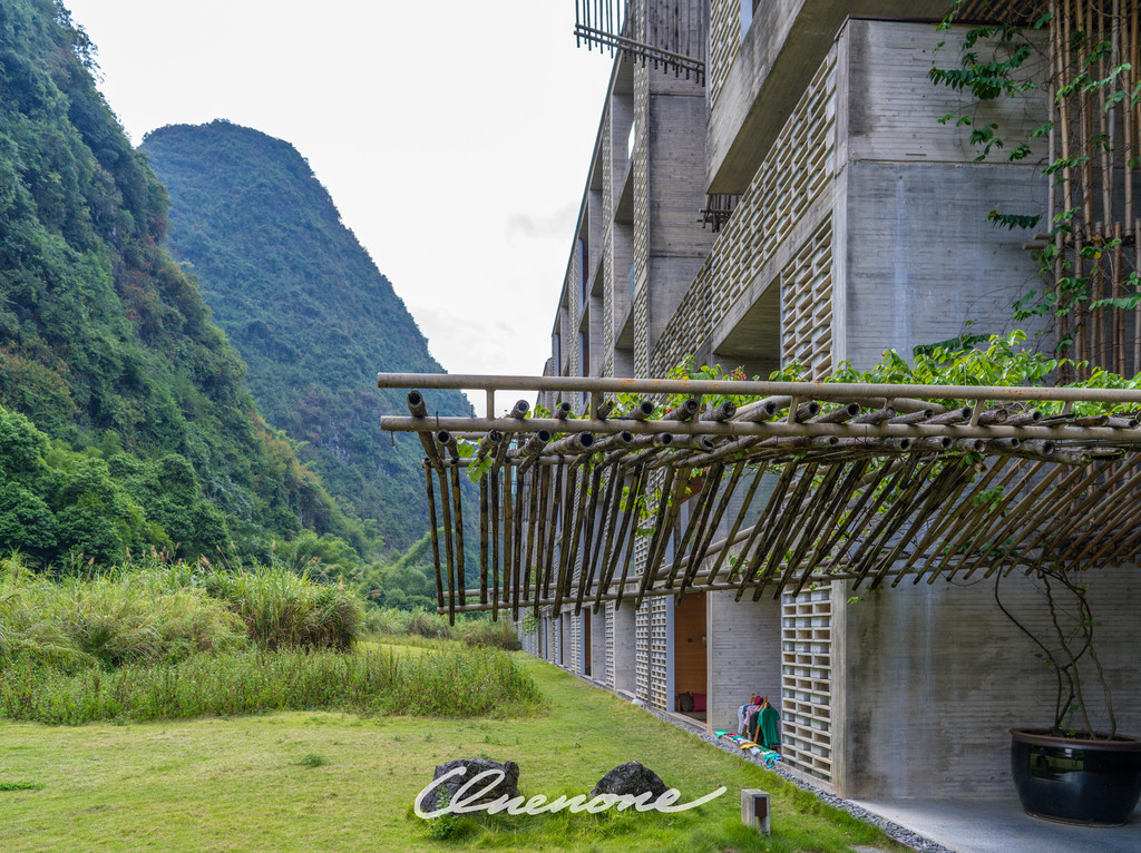 全山景客房主体建筑:整体设计线条感强烈,本着对当地自然景观和建筑文化的尊崇,设计师大量运用本地石材与竹子相结合的手法,体现了建筑整体刚柔并济的特色。让人置身其中宛如探寻神秘溶洞一般,在整个入住过程中充满探索的乐趣。