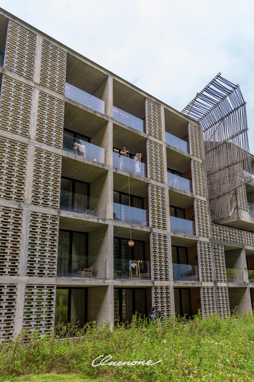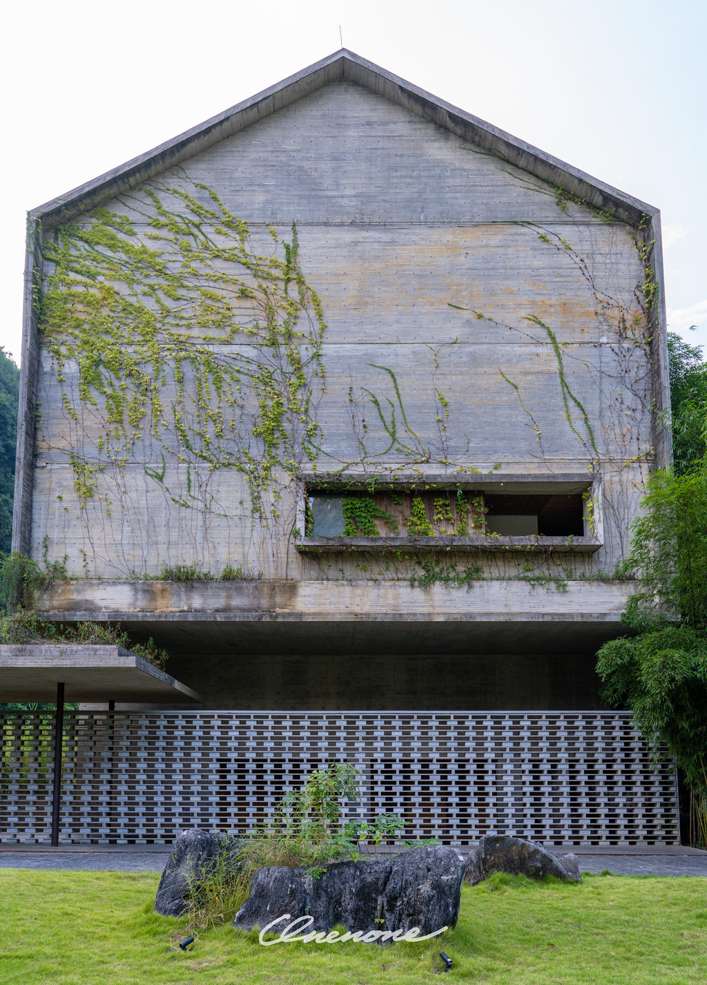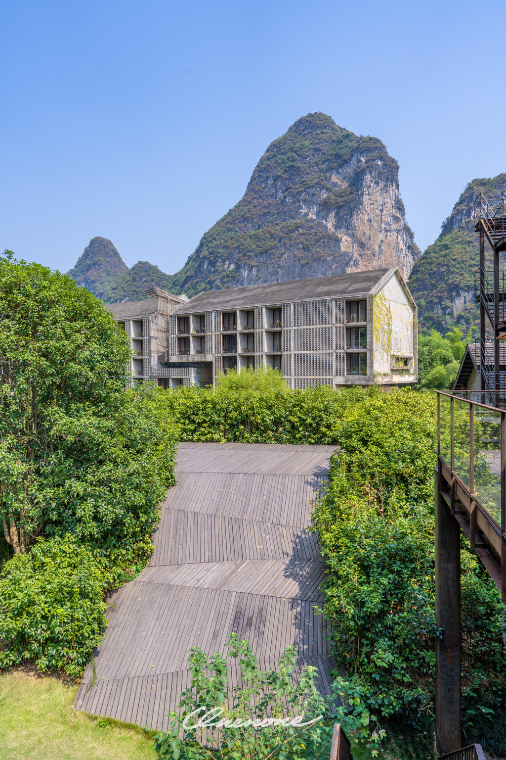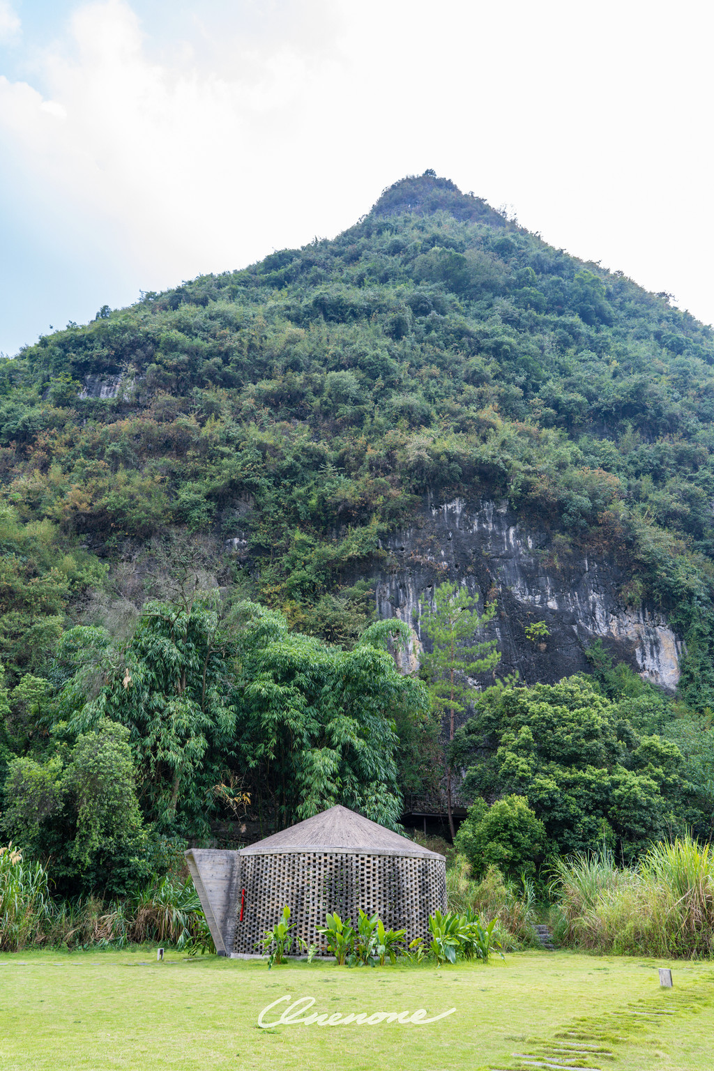 全山景客房主体建筑:整体设计线条感强烈,本着对当地自然景观和建筑文化的尊崇,设计师大量运用本地石材与竹子相结合的手法,体现了建筑整体刚柔并济的特色。让人置身其中宛如探寻神秘溶洞一般,在整个入住过程中充满探索的乐趣。