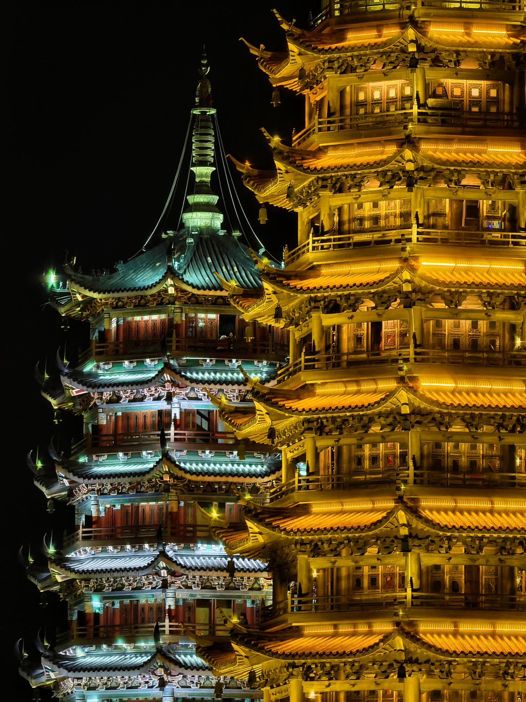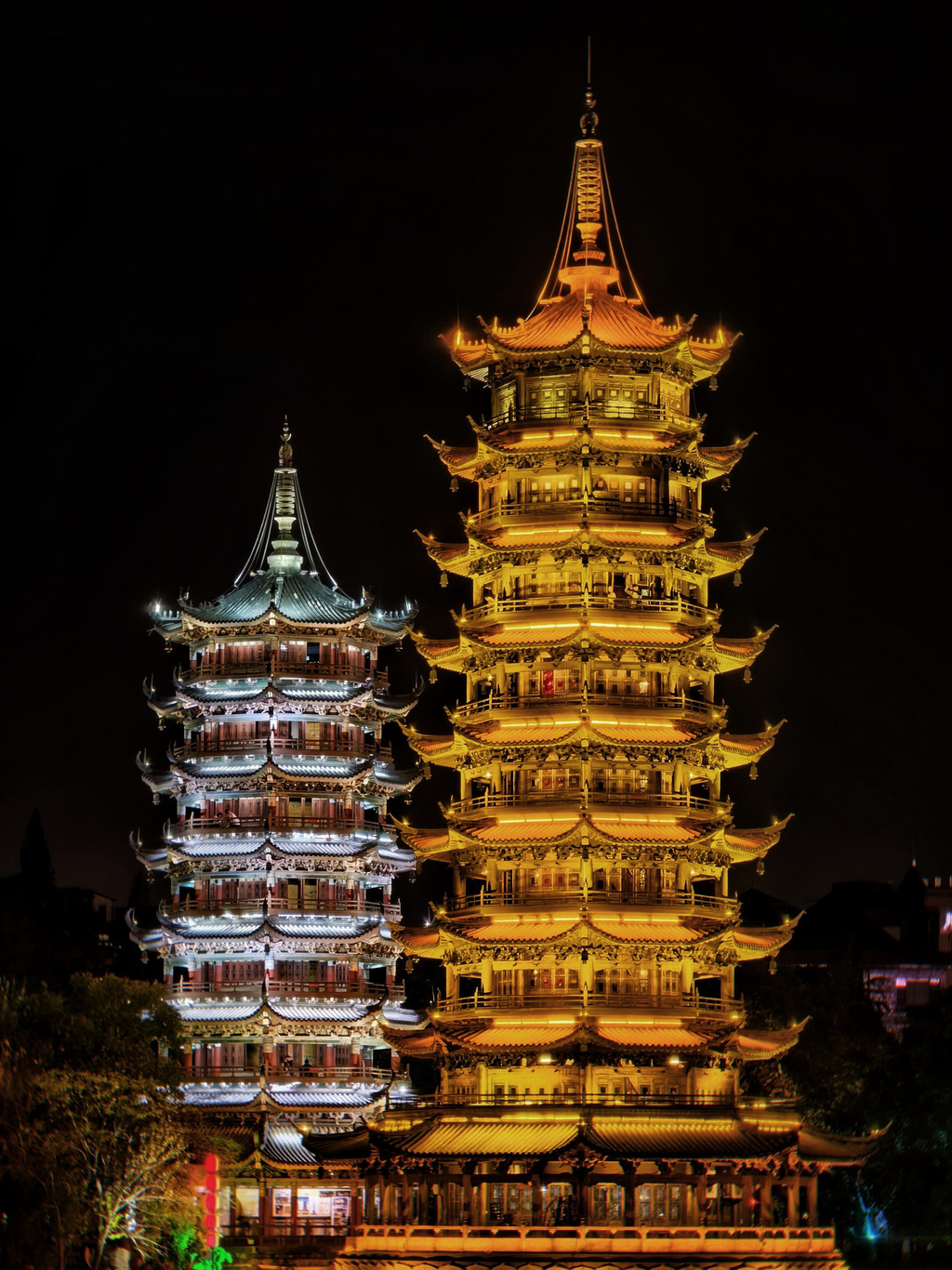 晚上双塔一金一银交相呼应,不过实际亮度没有照片那么鲜亮。另外晚上两江四湖游船听说也是不错的游览方式。