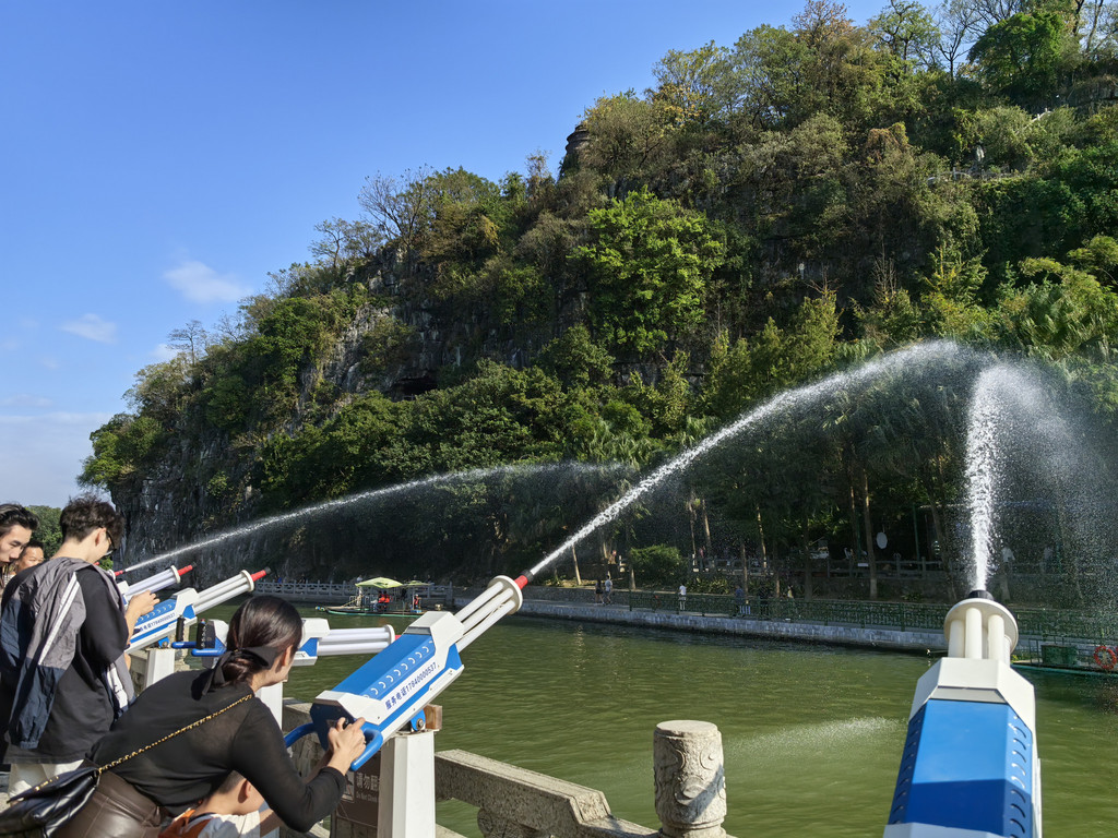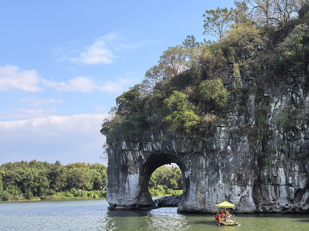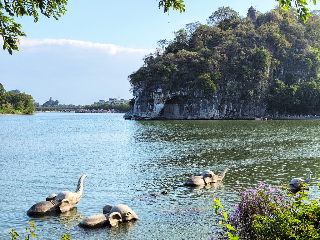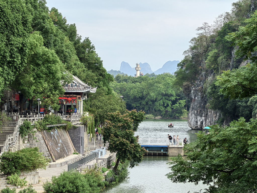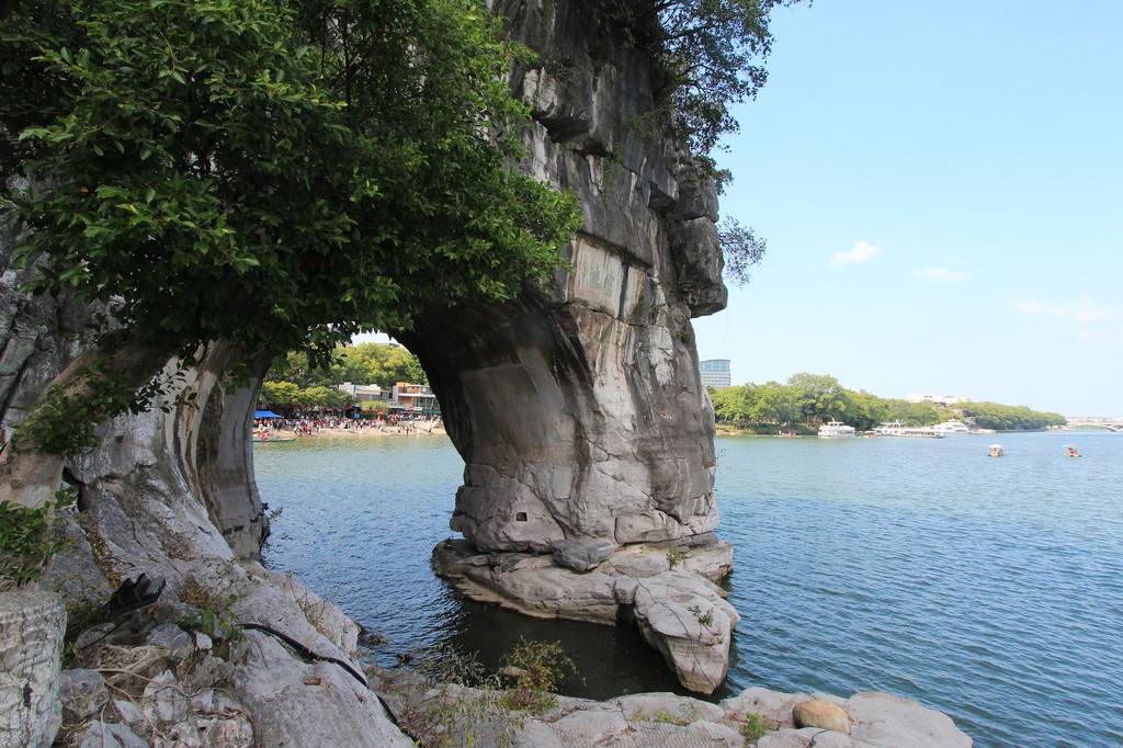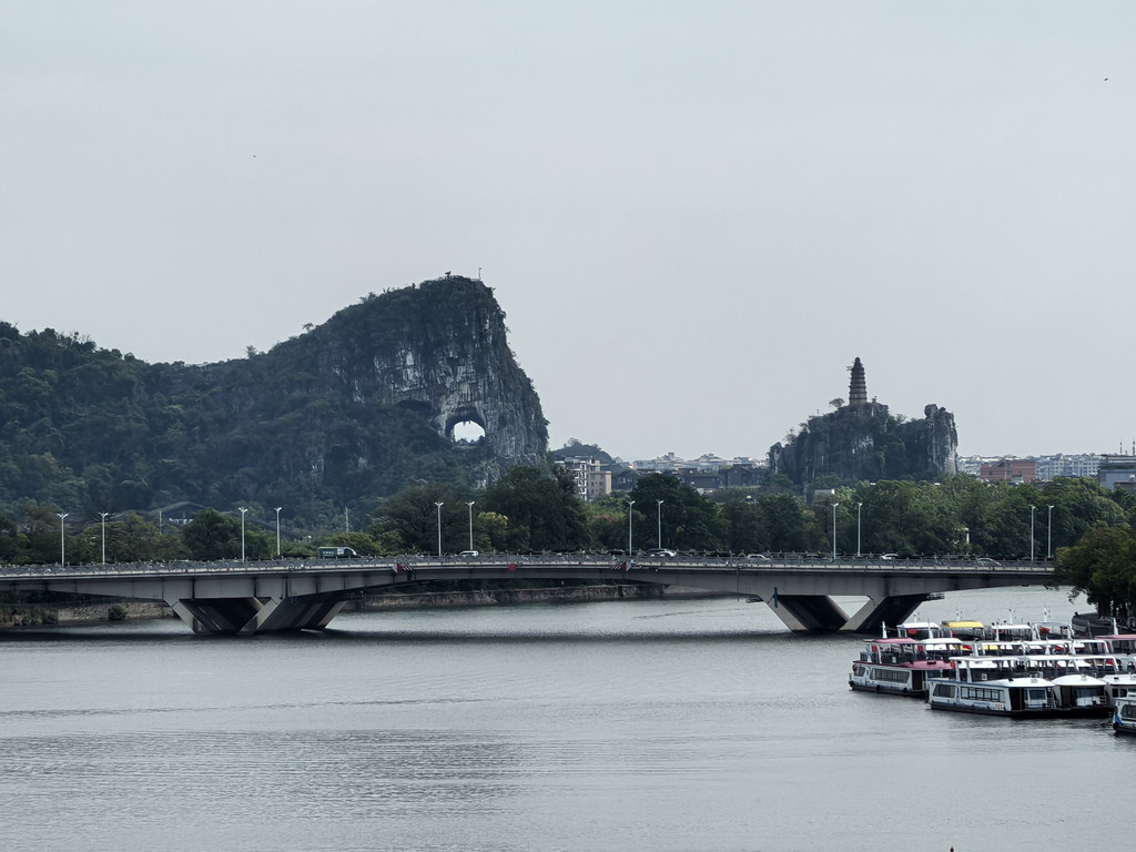 回到山脚下,左边另一端走过浮桥过了小河(桃花江),右走到岸边就是最经典的远观象鼻山全貌的角度,也是游客集中地。