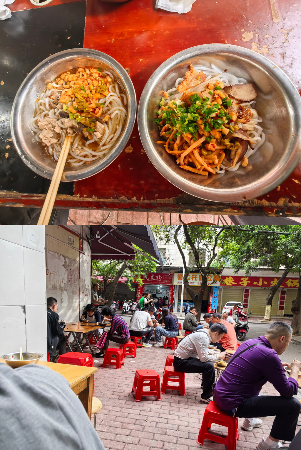 今天是桂林的收尾节点了,怎么也得体验下充满市井气的桂林米粉。碗碗都市香米粉店,坐在路边小板凳上吃着5元二两的粉,接地气。