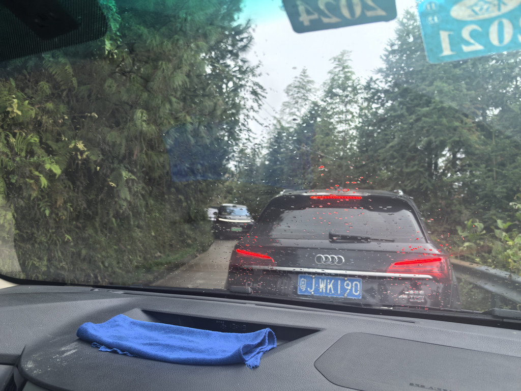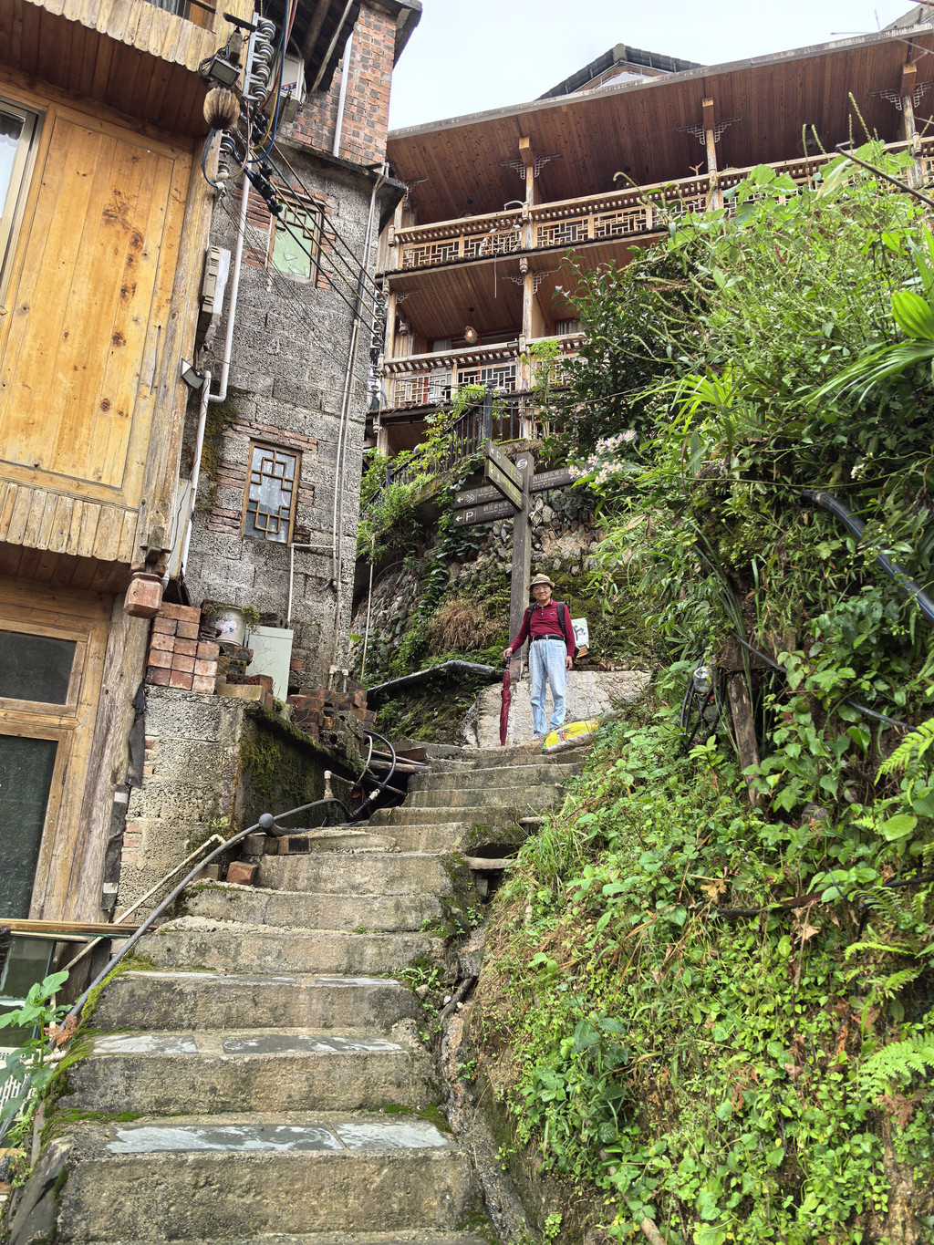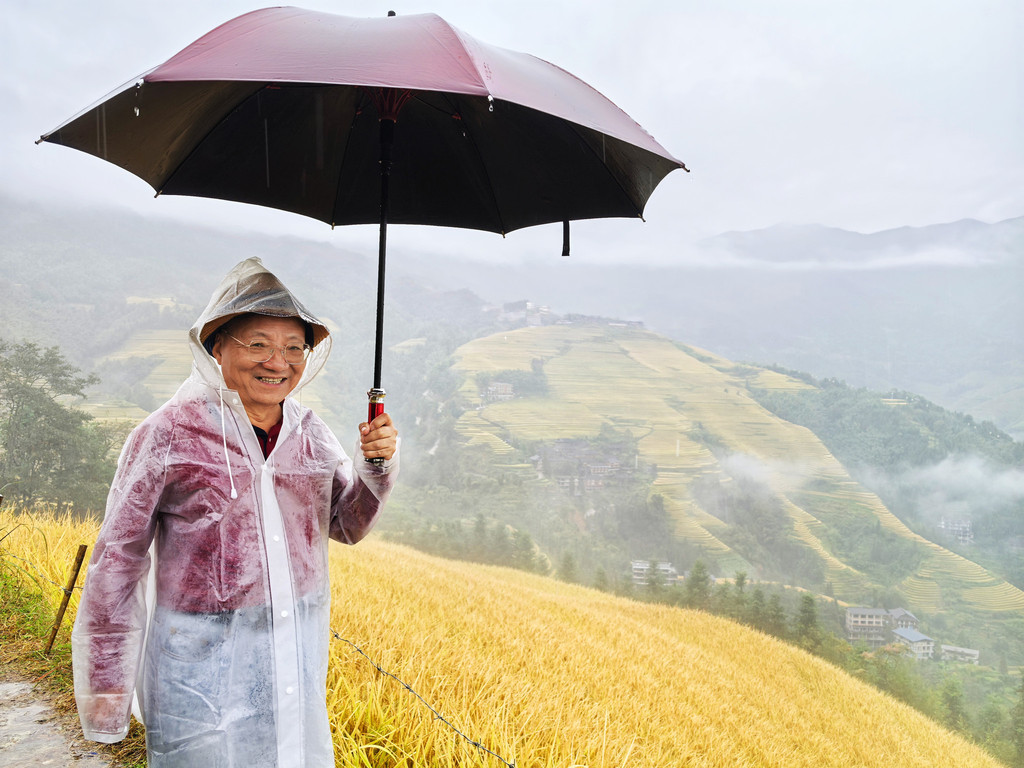 下午等了好久也不见雨停,基本我是觉得此次梯田行要报废了。但在房间时不时会有一瞬间看的出一星半点朦胧的梯田,于是我和老爸还是决定去最近的观景台碰碰运气。下雨路滑,又有山路斜坡,安全起见老妈还是在房间休息。