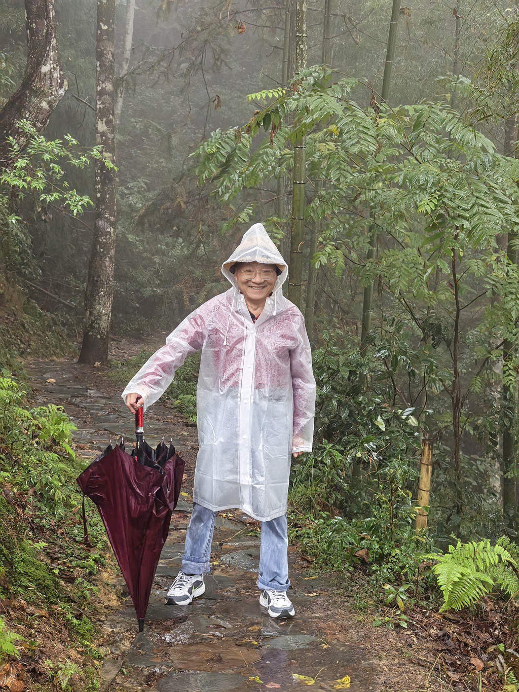 这就是我们到达2号观景台千层天梯时的状态。下方就是梯田,请自行想象~哈哈哈~然后我们又在那找了个避雨处,坐了约20分钟。依然什么也看不见便准备原路返回了。