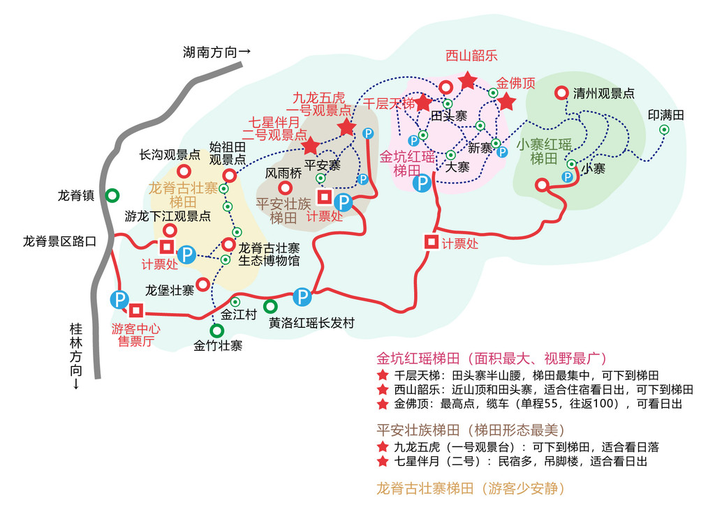 先说说龙脊景区,一共有金坑红瑶寨、平安寨、古壮寨三大寨组成,最新的景区地图里也会发现有新增一个小寨。但一般这里游玩一两天的,建议不要把目标定的太广,寨与寨之间距离非常远,几乎无法完成。