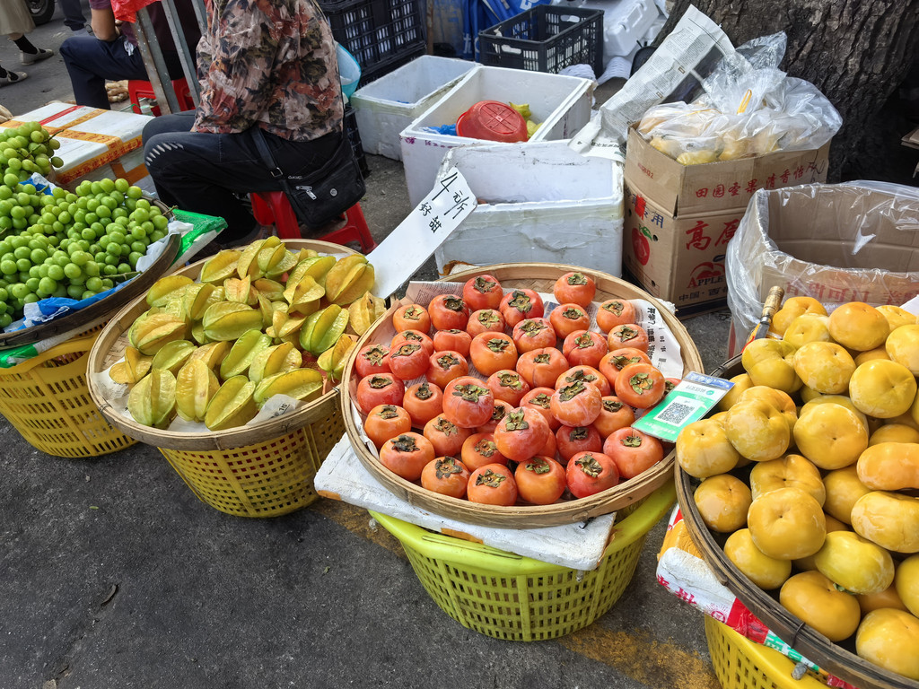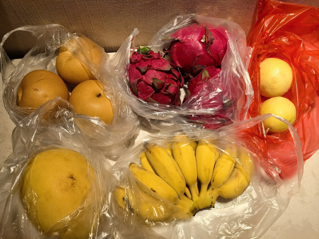 我们买了香蕉(5元)、火龙果(10元3个)、芒果(4.5元)、百香果(5元)、秋月梨(7元)。其中火龙果、香蕉和芒果又便宜又好吃。别人提到的黄皮果我也很想尝尝,但这个季节没有。