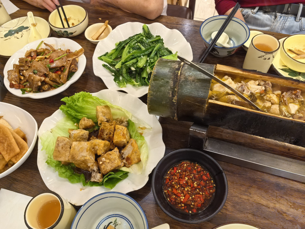 午餐漓悦江景餐厅比较靠近人民币观景台,优势就是古镇范围内的提供免费接送。酸笋鸭掌煲,能接受螺蛳粉的一定得尝尝,好吃~