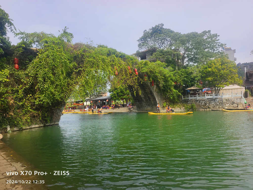遇龙桥码头正是遇龙河上最具典型的一段漂流,遇龙河有全域漂流,也要分段漂流,我们去的是遇龙桥至下游不到3公里的分段漂流,来回40分钟左右,每人另收竹筏漂流费100多元,我们感觉岸上看到景色与船上看到的景色应该没什么不同,而且行动更自由一些,所以我们选择了岸上步行。