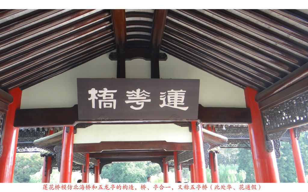 五亭桥,又名莲花桥,因外形从空中鸟瞰像一朵莲花而得名。建于乾隆二十二年(1757年),是扬州巡盐御史高恒出资,仿北京北海五龙亭和北海大桥而建。著名桥梁专家茅以升评价:中国最古老的桥梁是赵州桥,最壮美的桥梁是芦沟桥,最秀气最具艺术代表性的桥梁是扬州的五亭桥。