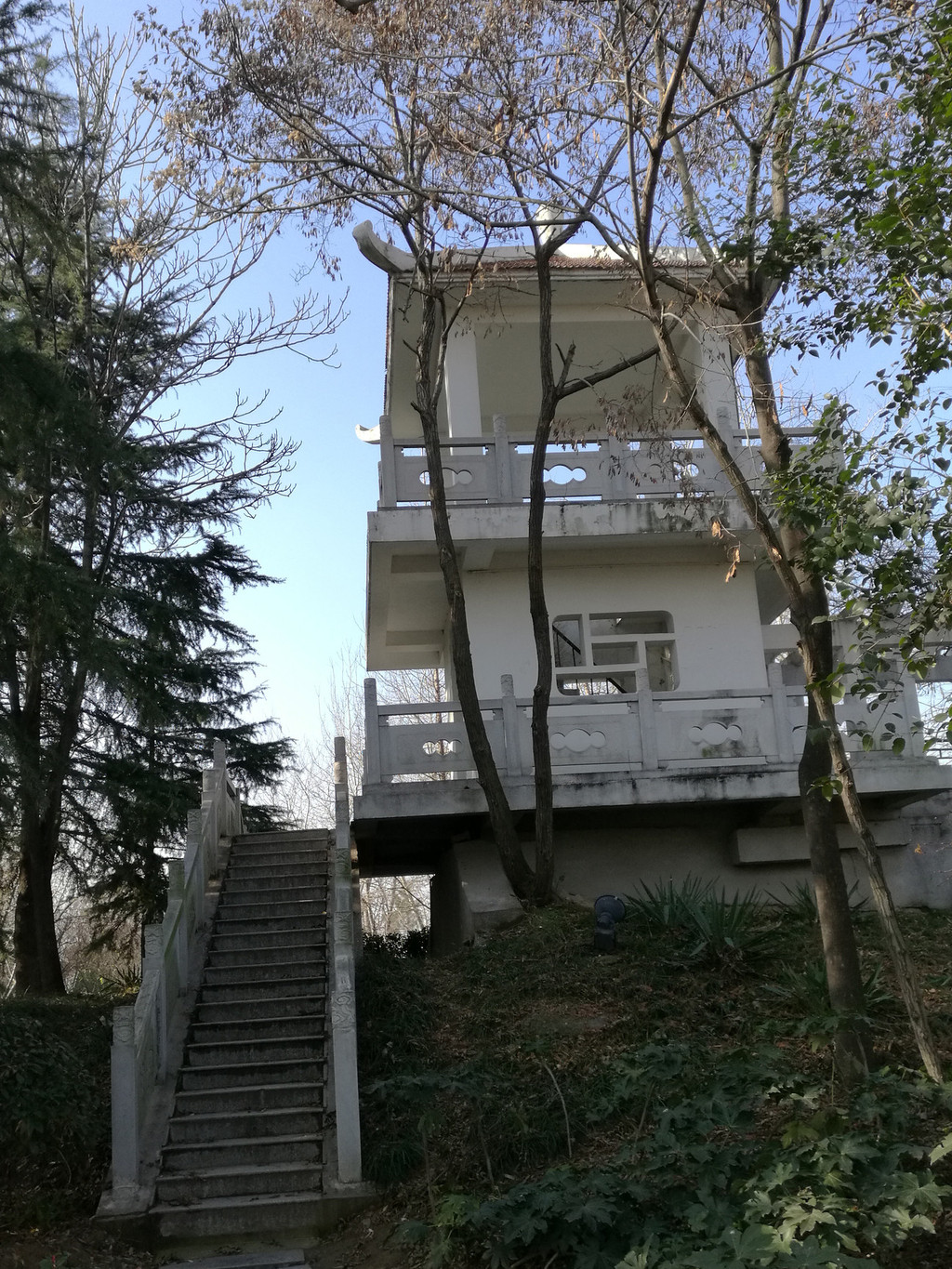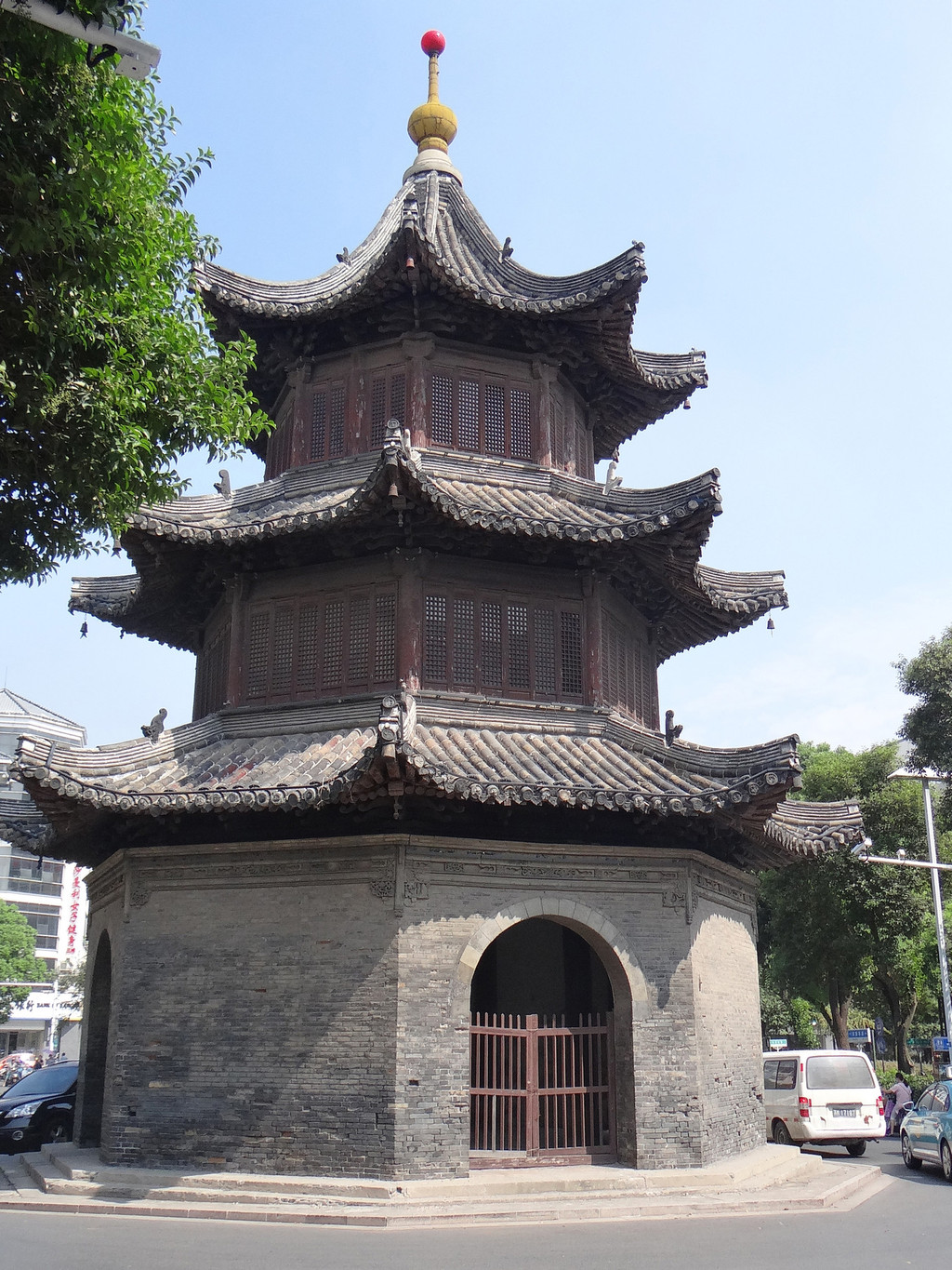 四望亭,砖木结构,八面三层,攒尖式瓦顶。每层亭檐有八个飞角,每个飞角都有风铃。