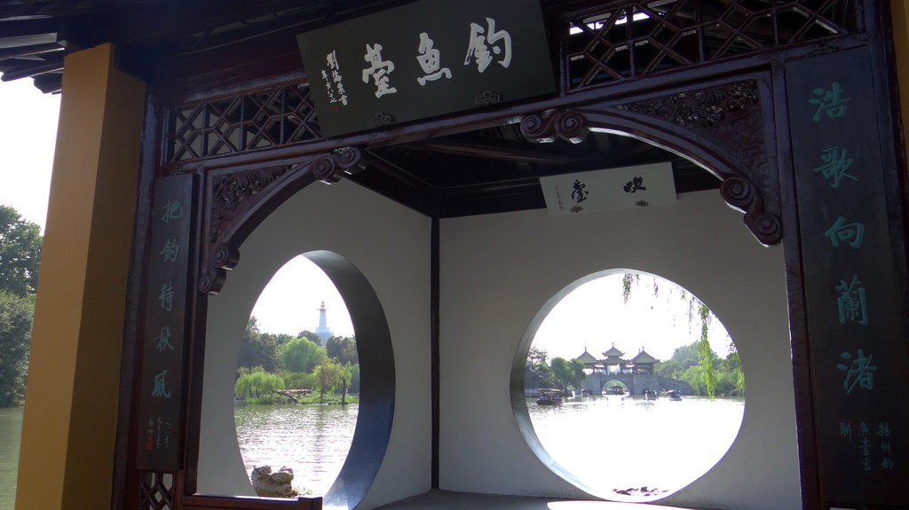 国内以“钓鱼台”命名的景点很多,瘦西湖的钓鱼台体量最小,但极富特色,是园林“框景”“借景”艺术的代表作。站在钓鱼台斜角60度的地方,可通过正西面的洞口借景五亭桥,五亭桥横卧波光,洞成正圆形;而通过南面的洞口可借景白塔,白塔如破地竹笋冲天而出,把洞拉长呈椭圆形,这样的景致堪称绝妙图画。