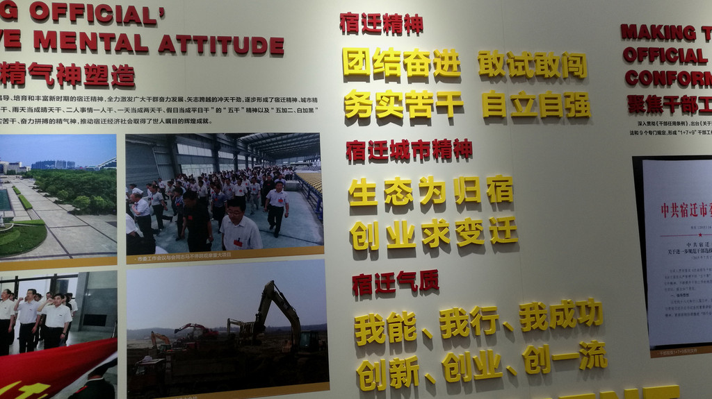 宿迁古老又年轻,1996年撤县建市。基于特殊市情,宿迁人在建市不久就提出“团结奋进,敢试敢闯,务实苦干,自立自强”的“宿迁精神”。后来把城市精神表述为“生态为归宿,创业求变迁”,激励全市上下“闯”、“创”,打造生态宿迁、和谐宿迁。
