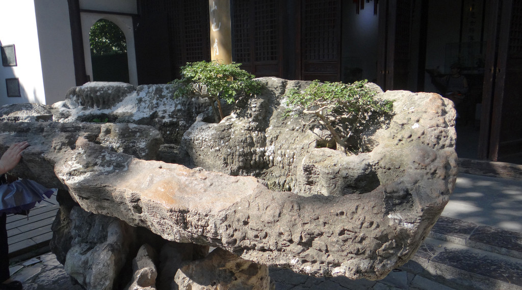 船形钟乳石盆,北宋“花石纲”遗物,1953年由东圈门“壶园”移来。整块石头长262厘米、宽88厘米、最高处49厘米。雨天透过其中的积水,可以看到峰峦倒影,仿佛天然的山水盆景。