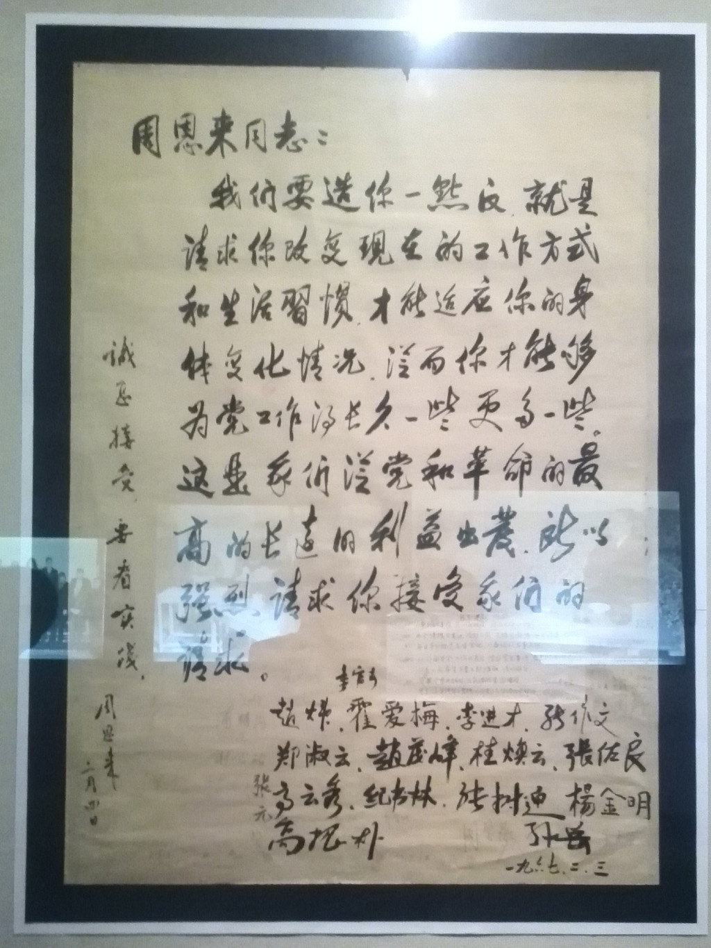 一张大字报。周总理经常一天工作十七八个小时,有时甚至通宵达旦。身边工作人员看到他这样不知疲倦地日夜操劳,都为他的健康着急。同志们轮流提意见,甚至联合起来写了一张大字报,劝他注意身体、劳逸结合。