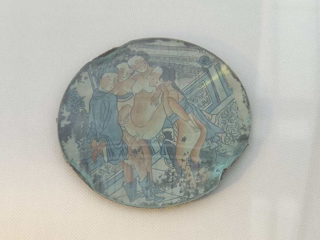 彩绘春宫纹布纸玻璃镜(民国)