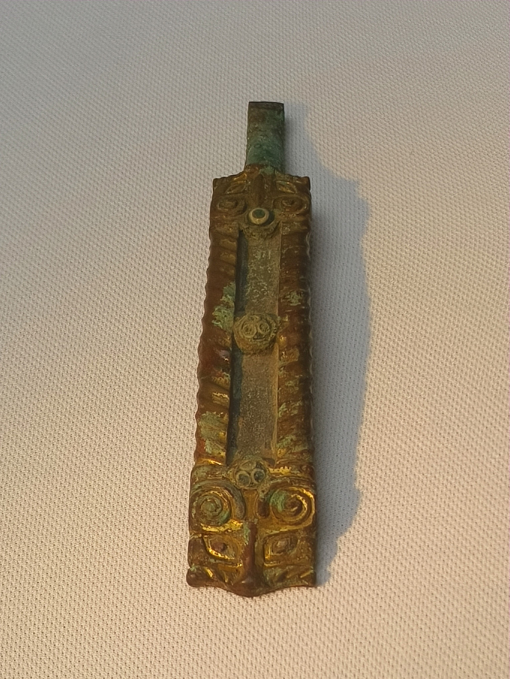 镶嵌三星纹蜻蜓眼龙首琵琶形铜鎏金带钩(战国)