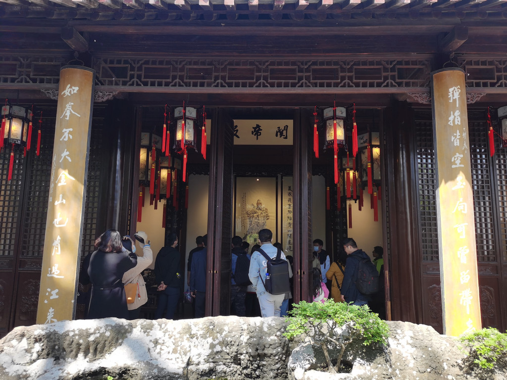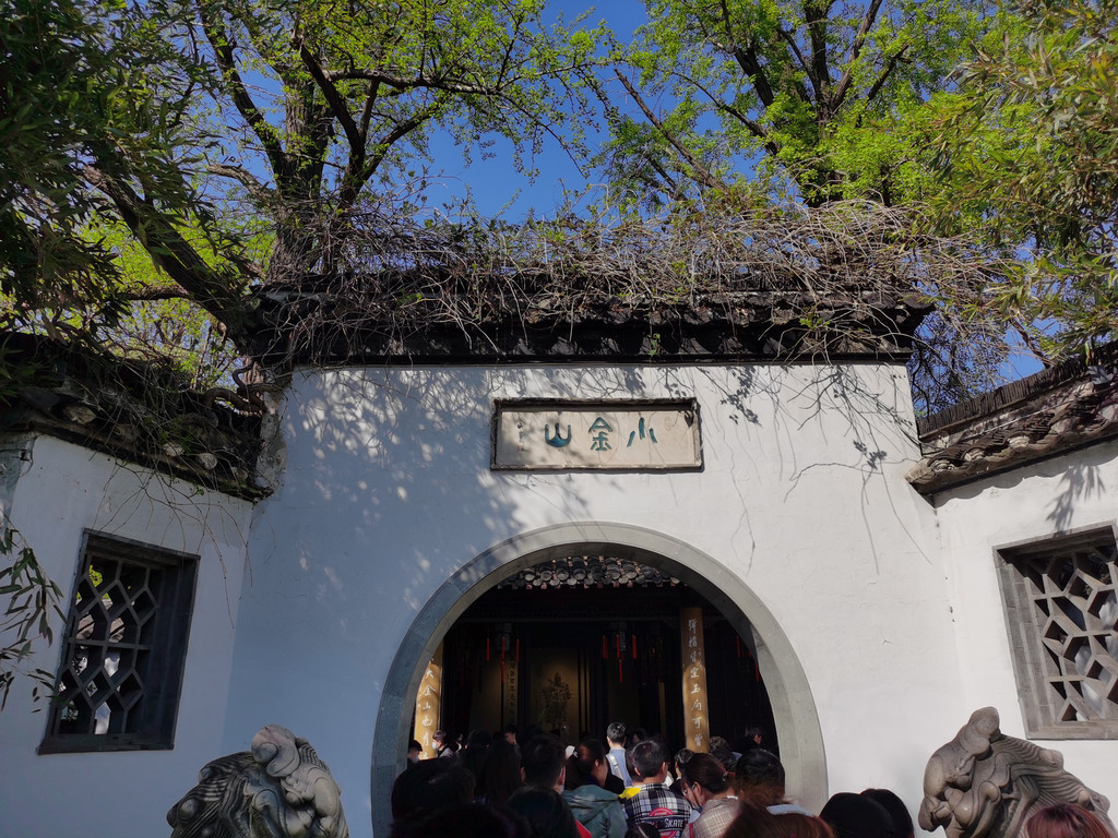 然后就来到了小金山,小金山的由来就比较有意思了。流传着两个和尚,一个和尚说“青山也厌扬州俗,多少峰峦不过江”,就说扬州这边是盐商做生意的地方,所以山是清秀的,就不能到扬州。扬州和尚不同意这种说法,于是他两就下棋对弈,结果扬州和尚赢了,然后就把小金山搬过来了。但是关帝殿门口的对联有说是苏东坡写的,棋是苏东坡和和尚下的。具体是哪种说法还望请评论区大神讲解。