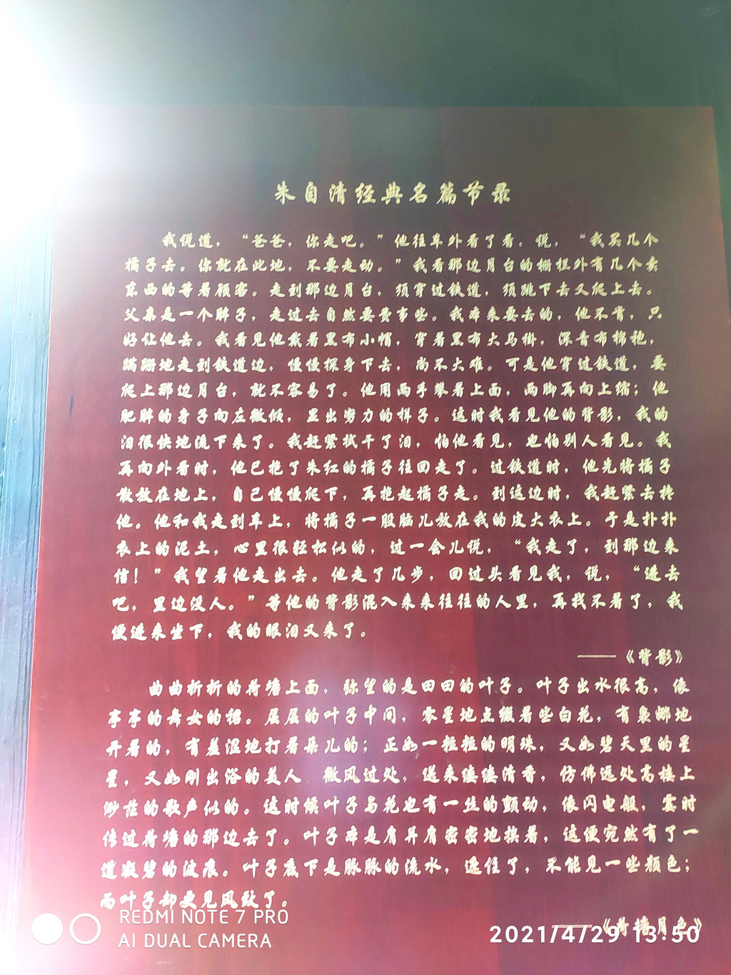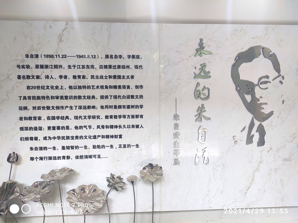 恍惚间,我看到:朱自清在这里慢慢地走过;他低着头,皱着眉,若有所思;一会儿又露出感慨的样子。朱自清在这里静静地呼吸,在这里生活……