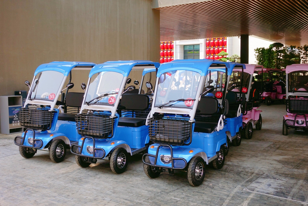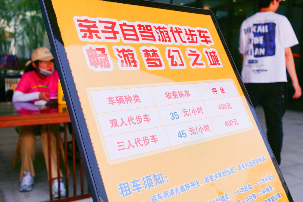 在园区的不同位置有可以租借的代步车,像我们带宝宝的就很适合,租一辆按时长收费也不贵,当然如果不租车的话,就建议带着宝宝推车,这样万一宝宝犯困了还能休息,爸爸妈妈可以轻松轮流玩乐园里的项目了,简直就是带娃玩耍两不误。