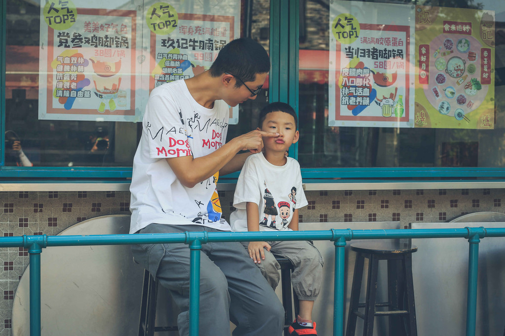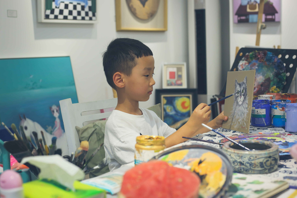文创小店里的绘画大师,大隐于市,在熙熙攘攘的街道一角,沉浸在自己的艺术世界,娃儿也被满桌子的五颜六色所感染,拿起大师的创造,来个锦上添花吧。