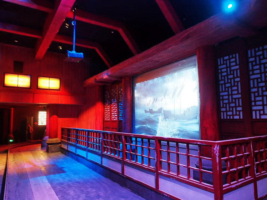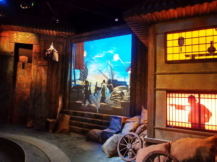 轨道车慢慢地滑动,两边的墙上,投影出各个朝代的扬州,那感觉十分奇妙,好像在看一场电影,自己,却又是画中人。
