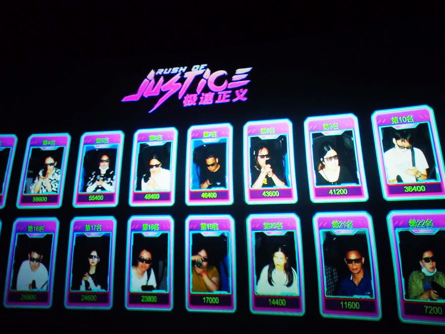 所有人戴好眼镜,扣好安全带,拿起座位侧边的电子枪,极速正义的游戏开始。瞄准,射击,屏幕上的人物应声倒地!