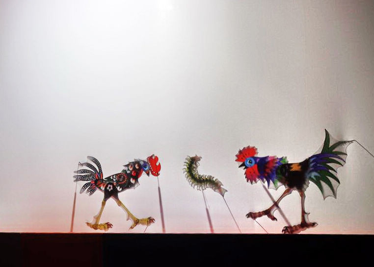 两只雄鸡气势汹汹,各不相让,飞起跳下,简直跟活的一样,要不是幕布后面隐隐的线,谁敢说这是两只木偶鸡呢?