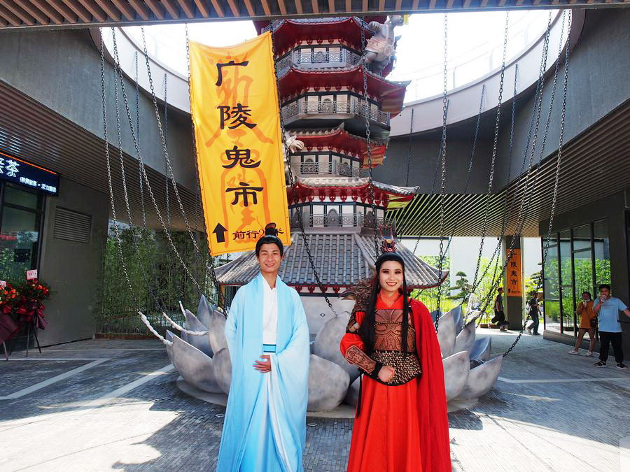 广陵鬼市?广陵我理解,扬州的古称,鬼市又是神马?不过招牌下站着的小哥哥小姐姐,倒是挺大方的,看到镜头,立刻敬业地摆好了姿势,大获好感。