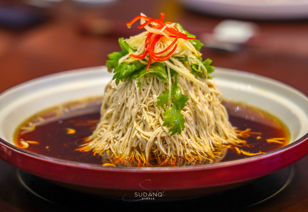 万丰酒店的淮扬菜既保留了传统,又进行了创新。推荐菜:鮰鱼狮子头、盐水鹅(淮扬菜品中的最爱)、煮干丝(扬州传统名菜之一)、招牌蟹黄豆腐、金汤波士顿龙虾、万丰烤鸭、鸡汤捞黑虎虾滑。